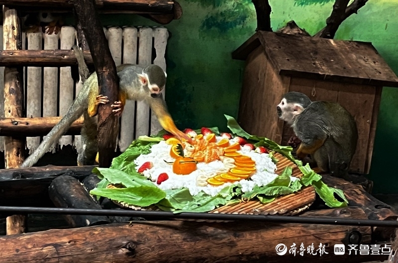 松鼠猴的团团圆圆甜蜜家宴:将橙子切片摆盘点缀上草莓、黄瓜等做成飞龙,寓意来年龙飞凤舞;虽然都是猴科动物,松鼠猴可是没心没肺,不管三七二十一拿起来就开吃,蹦蹦跳跳开心得不得了。