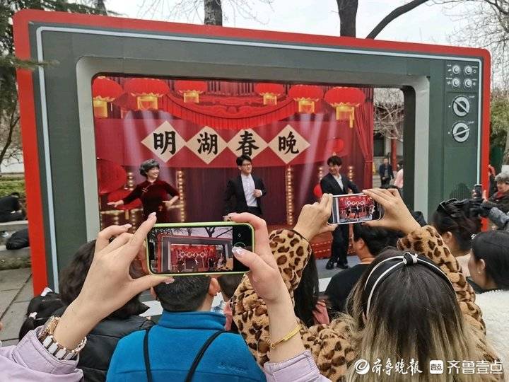 在庙会现场的《明湖春晚》,既能美陈打卡,又兼具舞台功能。在一部怀旧老电视造型的舞台中,每日上演陈佩斯、朱时茂在1984年央视春晚上的《吃面条》和费翔在1987年央视春晚上的《冬天里的一把火》等经典节目,引发广泛共鸣。这一场景被中央电视台大年初一的《新闻联播》节目选中,向全国观众展示了大明湖春节文化庙会的热闹盛况和精彩瞬间。