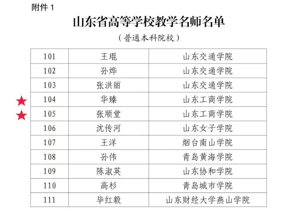 近日,山东省教育厅《关于山东省高等学校教学名师评选结果的公示》发布,全省共评出120名2023年度山东省普通本科院校教学名师,山东工商学院华臻教授、张顺堂教授成功入选。