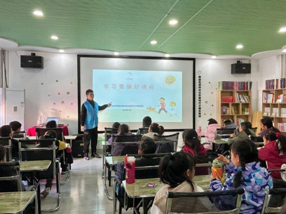 本次活动,常青藤志愿者协会聚焦思政热点,以学雷锋志愿服务月为契机开展一系列活动,团结引领青年学生投身志愿公益和社会服务活动,用实际行动将雷锋精神薪火相传。青年志愿者深入社区,引导孩子们了解雷锋、学习雷锋精神,以此弘扬雷锋的高尚品格和崇高精神。志愿者借助PPT和视频素材,生动地向孩子们讲述雷锋事迹,组织孩子们集中学习雷锋精神,以雷锋为榜样,争做“雷锋”少年。同时引导青少年踊跃上台发言分享自己的“雷锋故事”,在热烈的讨论中,成功激起孩子们对雷锋精神的浓厚兴趣,深化他们对雷锋事迹的理解和认知,使雷锋精神的种子得以在孩子们纯真的心灵中生根发芽。课堂学习之余,志愿者们还设计了一系列充满乐趣的游戏环节,如“导演说”“反口令”和“猜数字”等。在轻松愉快的氛围下,拉近彼此之间的距离,让孩子们在游戏中收获快乐,更在不知不觉中加深了对雷锋精神的理解,为他们的健康成长提供坚实的精神支撑。随着活动的圆满落幕,志愿者和孩子们一起合影留念,共同珍藏这段美好而难忘的时光。