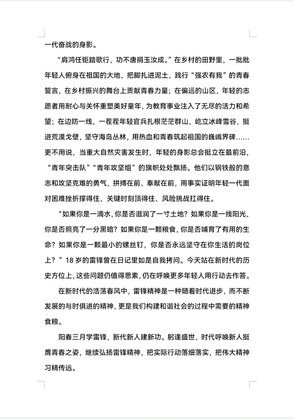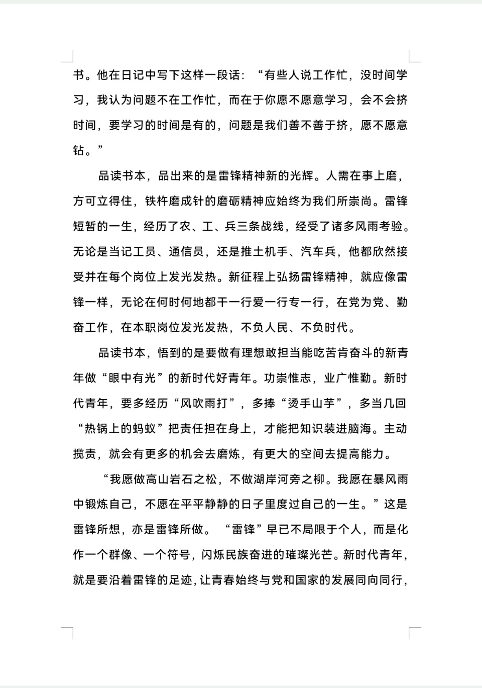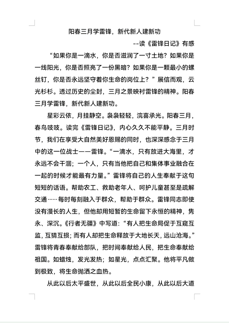 文学院学生深入研读《雷锋日记》,重温雷锋故事,感悟流淌其间的崇高精神,用饱含深情的文字记录下对雷锋精神的深刻理解与感悟:2023级1班褚凯鸽以细腻的笔触开篇,缅怀雷锋,在文中巧妙地穿插着雷锋语录,有力地凸显出雷锋爱党、爱国、爱社会主义的崇高理念。2023级2班刘子晓从细微之处入手,联系生活实际分享自己的感受:雷锋将生命无私地奉献给了人民,留下的不仅仅是一个名字,更是一种激励人心的、永不磨灭的时代精神,如同璀璨的星辰,永远闪耀在人们的心中。