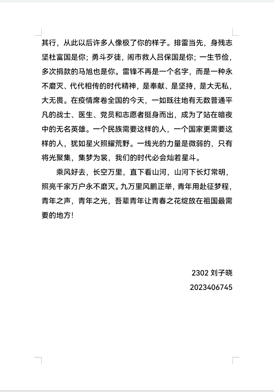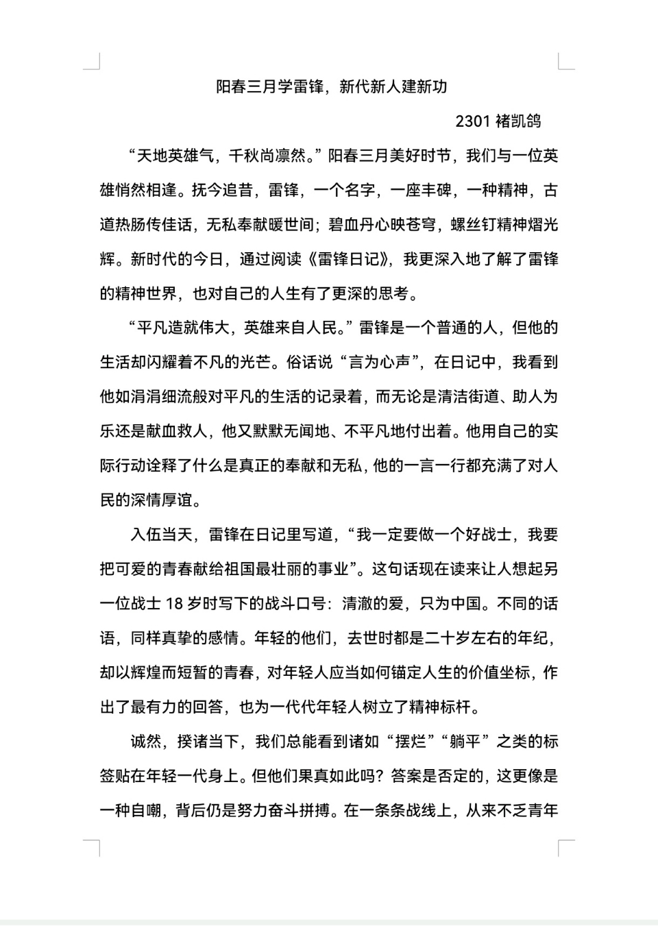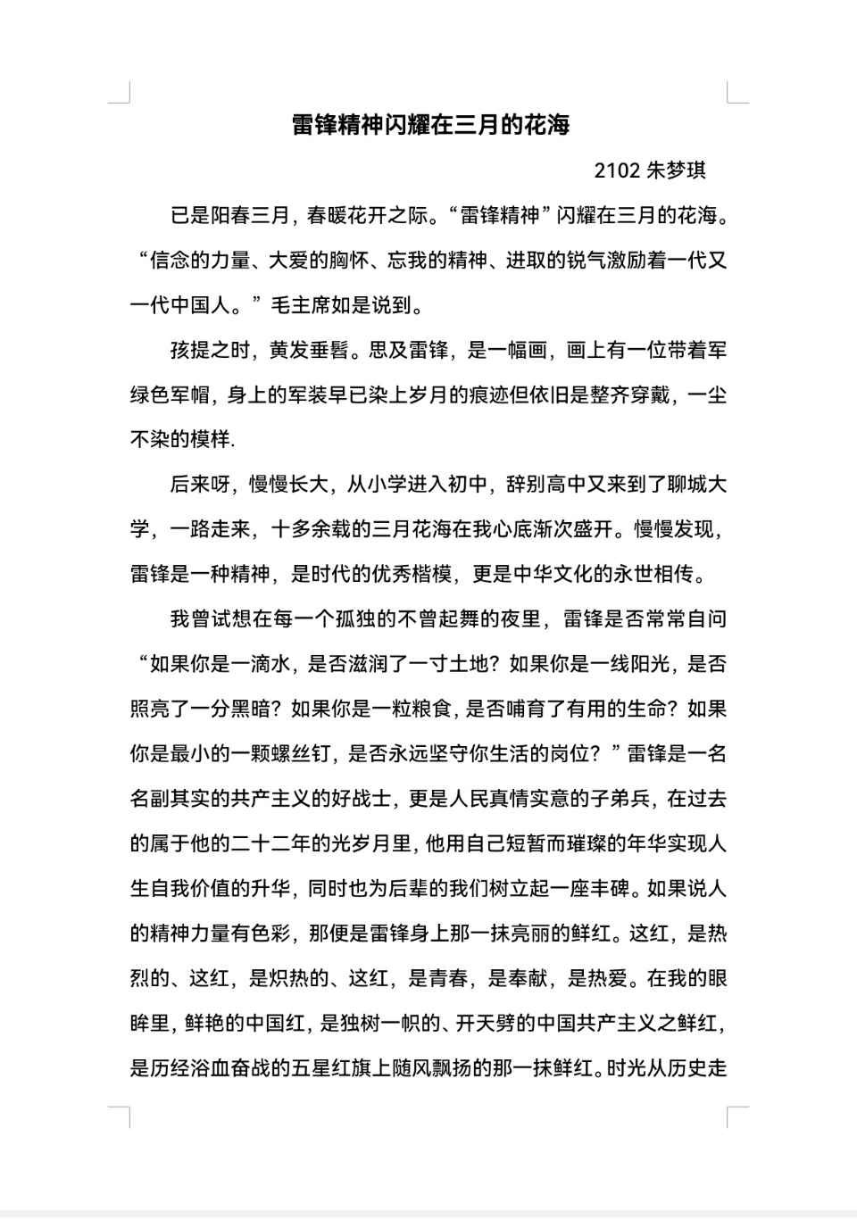 2022级6班韩璐认为雷锋精神体现了人民至上的价值立场,是一种不懈拼搏、勇于奋斗的奉献精神,是干一行爱一行、专一行精一行的敬业精神。她以生动的比喻和形象的描绘,诠释出雷锋精神的深刻内涵,使读者在品读文字的同时感受到时代的召唤。在2021级2班朱梦琪的笔下,雷锋精神伴随着她的成长,随着时间的推移对她产生了不可磨灭的影响。她在文中热情地为新时代青年加油鼓劲,呼吁他们勇往直前,为实现中华民族伟大复兴的中国梦贡献自己的力量。