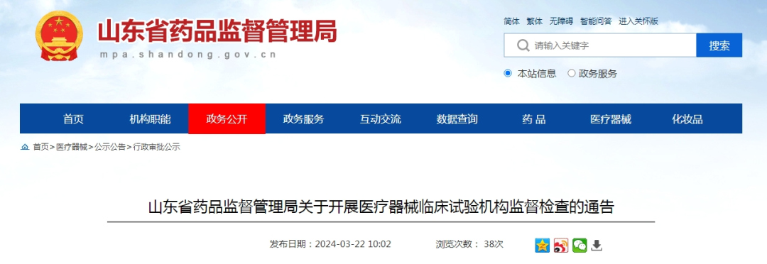 3月22日,山东省药品监督管理局发布《关于开展医疗器械临床试验机构监督检查的通告》。