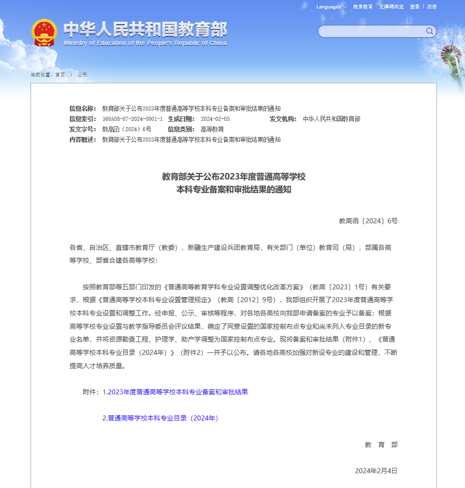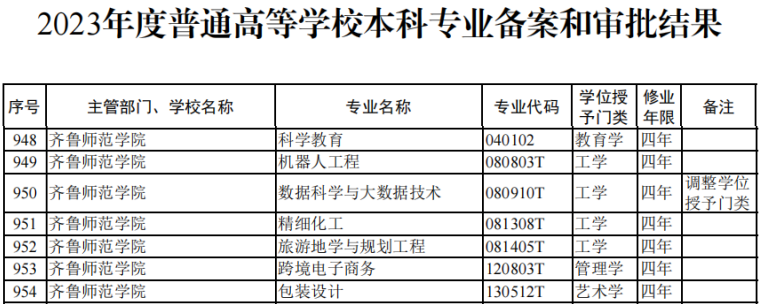 近日,教育部发布了《教育部关于公布2023年度普通高等学校本科专业备案和审批结果的通知》(教高函〔2024〕6号),齐鲁师范学院新增科学教育、机器人工程、精细化工、旅游地学与规划工程、跨境电子商务、包装设计6个本科专业,数据科学与大数据技术1个专业调整学位授予门类。