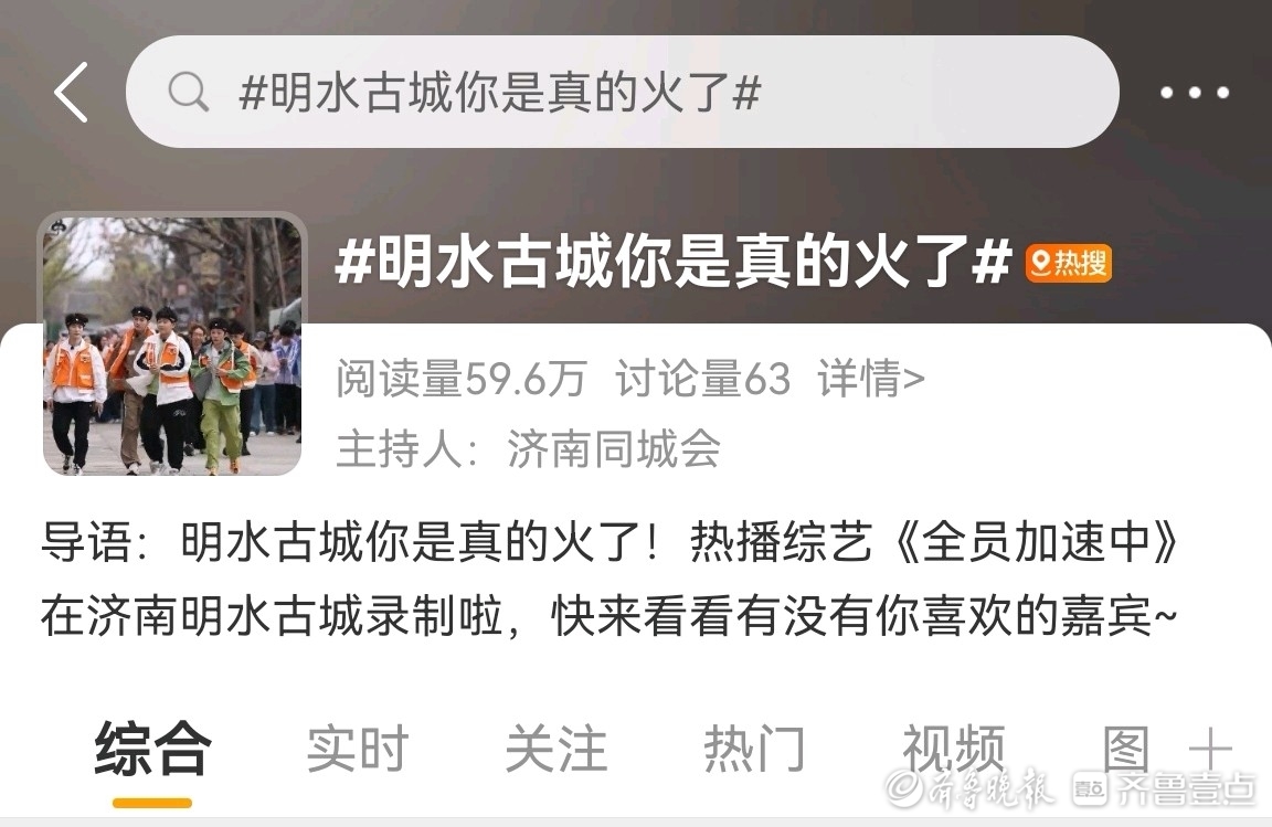 3月26日、27日,综艺《全员加速中》在济南进行为期两天的节目录制。作为拍摄地的明水古城,也备受关注。在录制当周,抖音端“明水古城”话题热度增加2000万,更有“明水古城你是真的火了”话题登上微博同城榜前三。