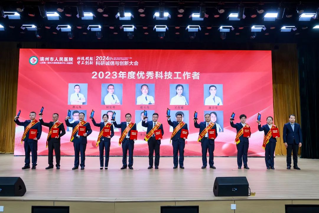 会上对医院2023年度“优秀科技工作者”邵元栋、周宪勇、张玉奇、吴肖婕、郭崇勇、刘明涛、赵伟珠、李九州、张玲玲、李燕燕进行表彰,颁发证书和奖杯,引导和激励全院医务科技工作者学习优秀、争当优秀。