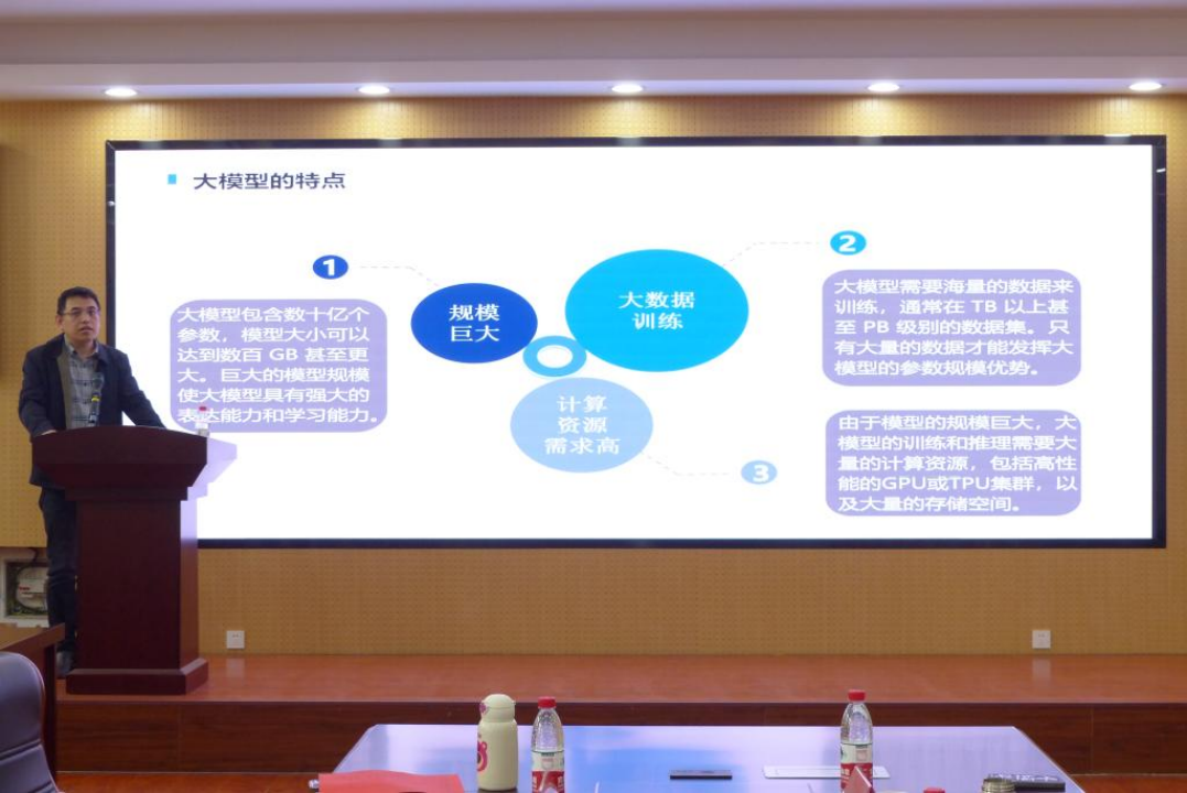 山东银瑞科技有限公司高级工程师孙卫华作专题报告。他从大模型概述、大模型训练、国产大模型及大模型应用等方面,对大模型进行了深入浅出的讲解。他指出,大模型作为具有大规模参数和复杂计算结构的深度学习模型,可以处理复杂的任务和数据,在未来社会有着越来越广阔的应用前景。他希望同学们可以增进对大模型的理解,应用大模型提高自己的学习能力和解决复杂问题的能力,为国家社会发展做出积极贡献。