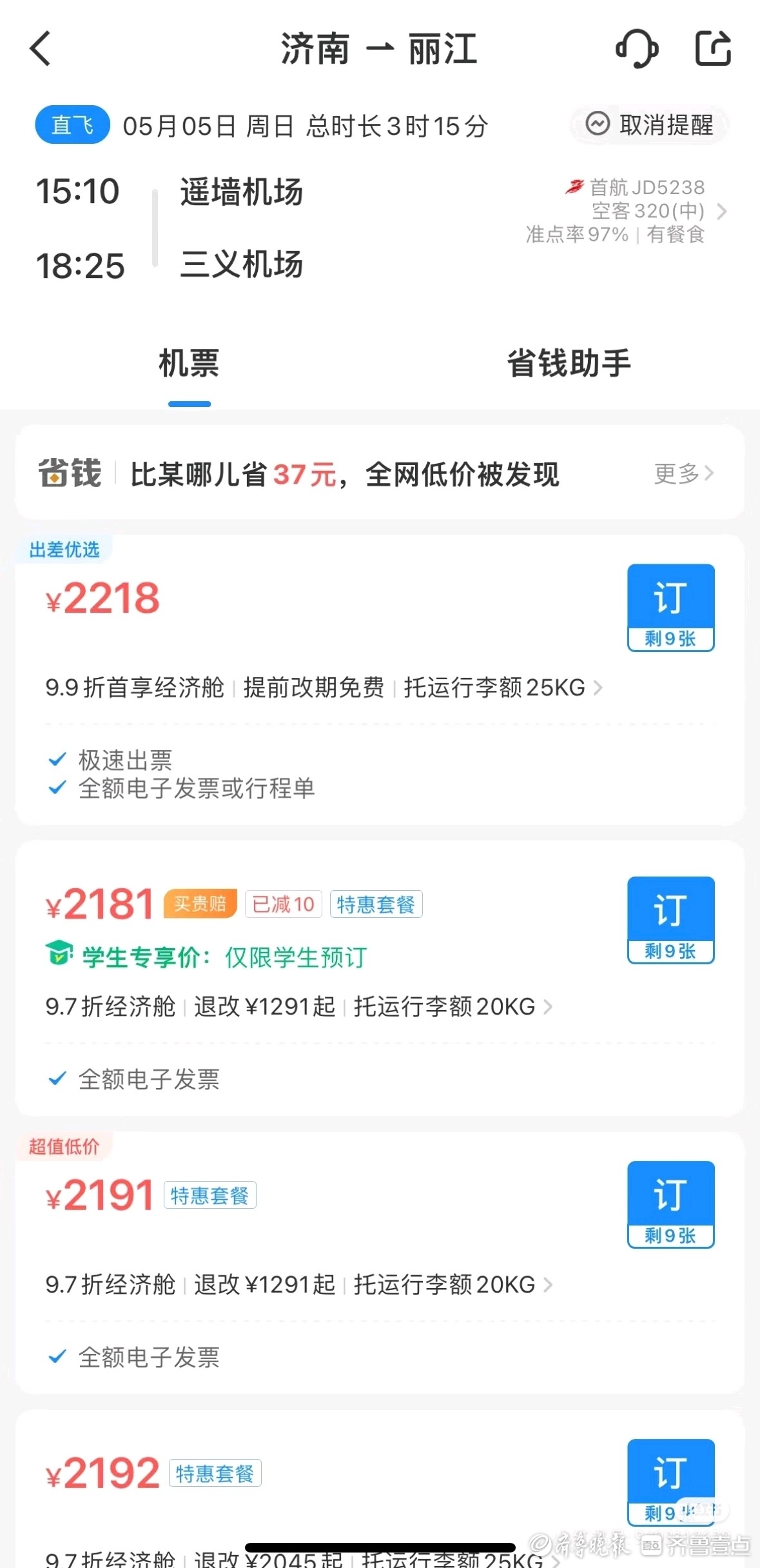 “打算5月5日到丽江,玩三天。”小杨提前一个月就为五一假期做起了准备,早在4月7日便将济南往返丽江的机票买好,购买时,单程价格为2200元左右,“这两天打开一看,同样的航班只用770元”。按照以往的经验,临近出发时间的机票价格会贵一些,所以他未雨绸缪买了机票,可谁承想“不升反跌”。