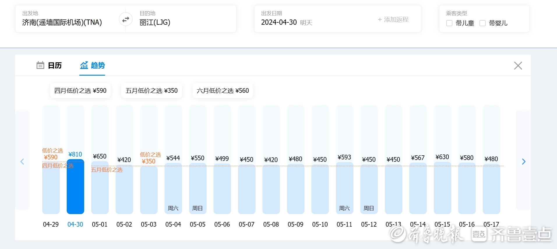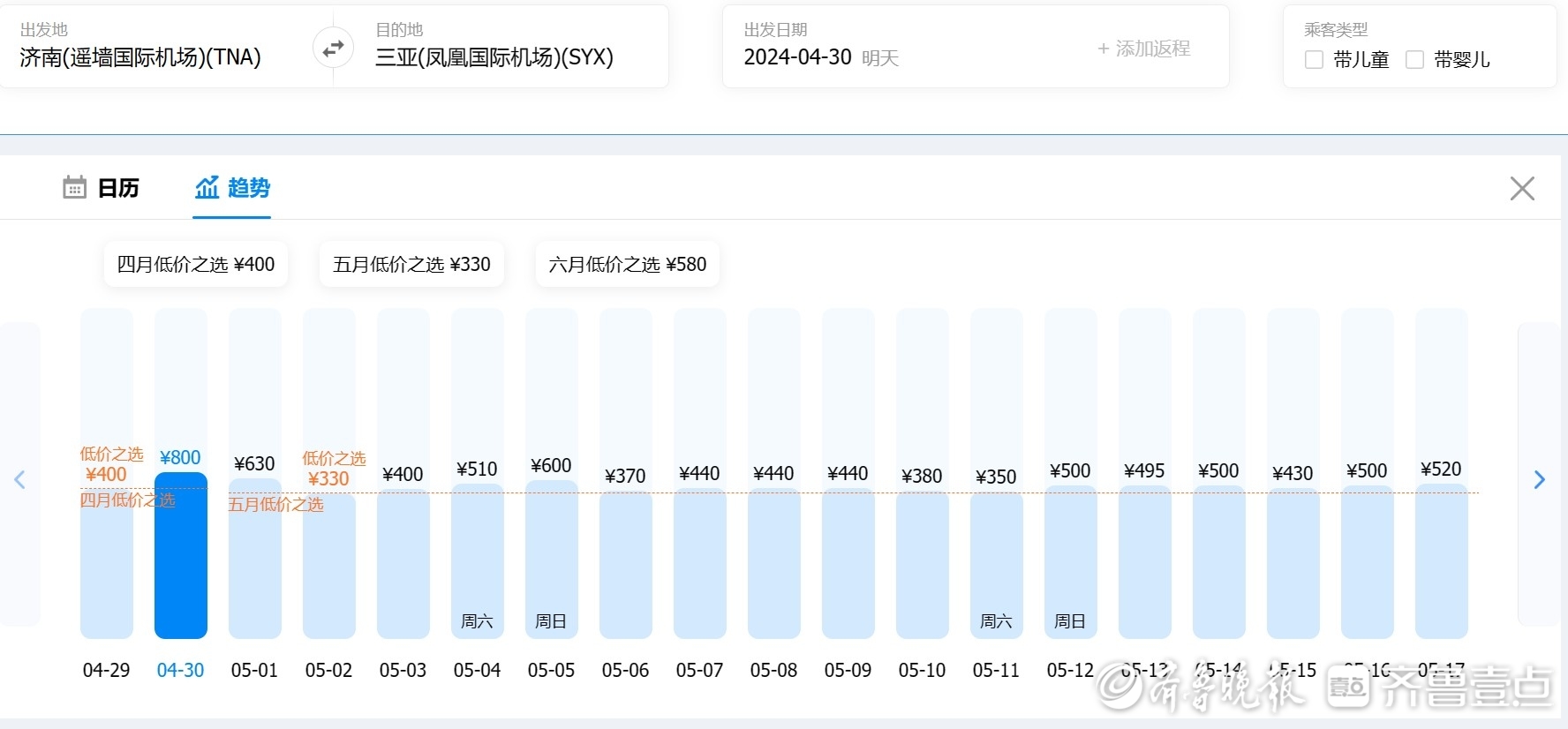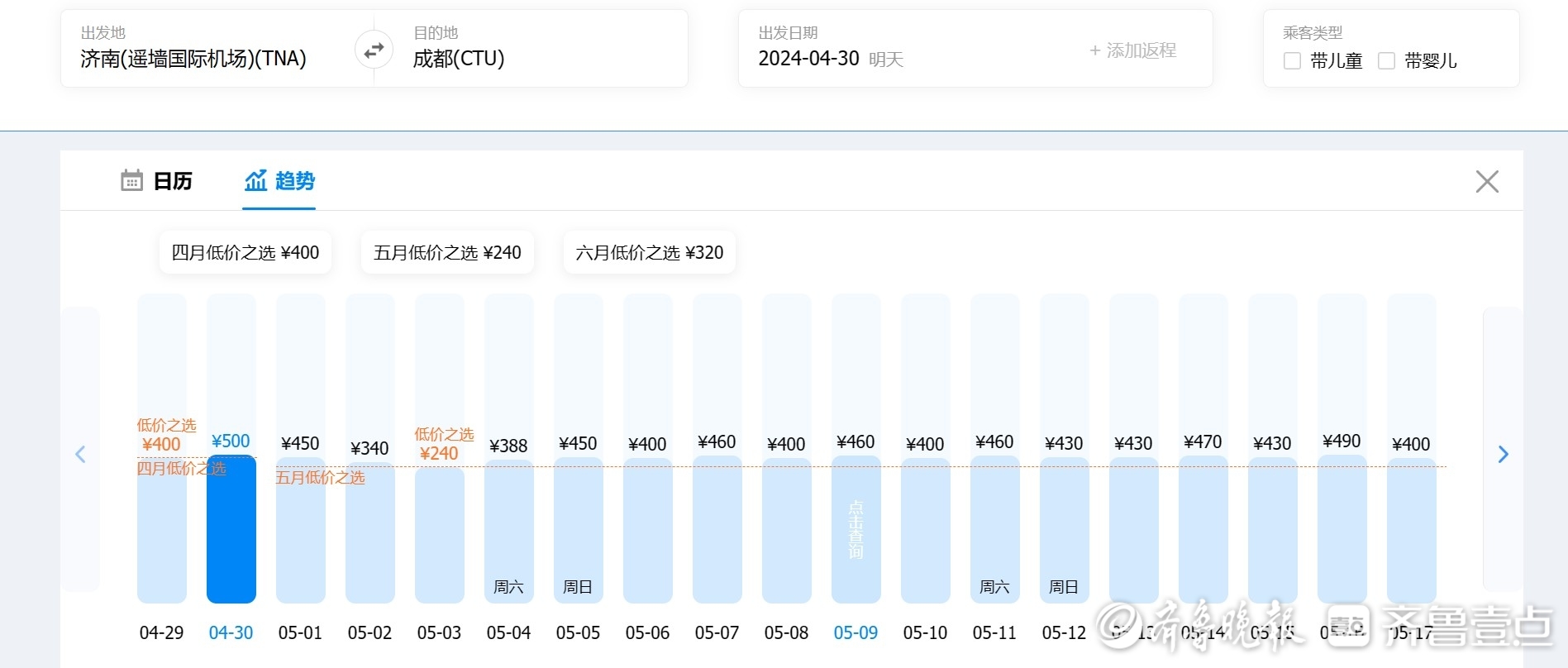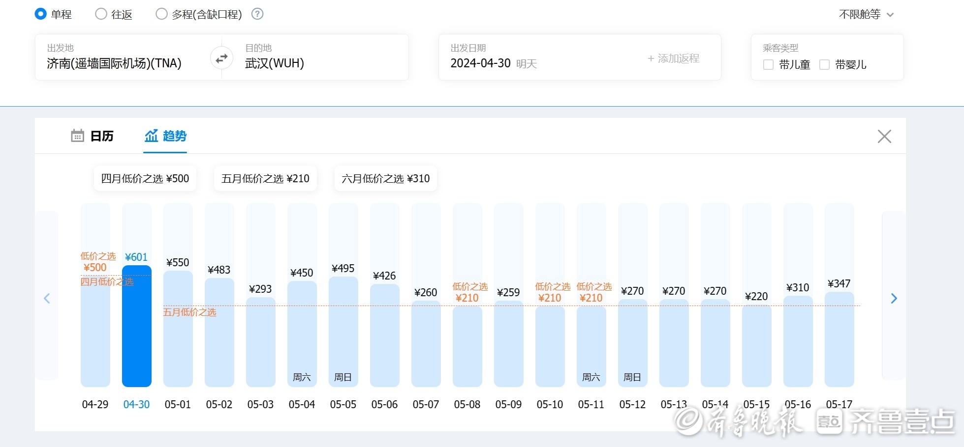 4月29日8时,记者通过携程旅行平台发现,以济南为出发地,4月29日、30日出发去往成都、三亚、丽江、武汉的单程航线均有400-500元左右不等的低价票在售。值得注意的是,同样以上述地点为目的地,5月2日、3日济南出发的单程机票价格均较4月29日、30日、5月1日三天有较明显回落,且存在低价票。