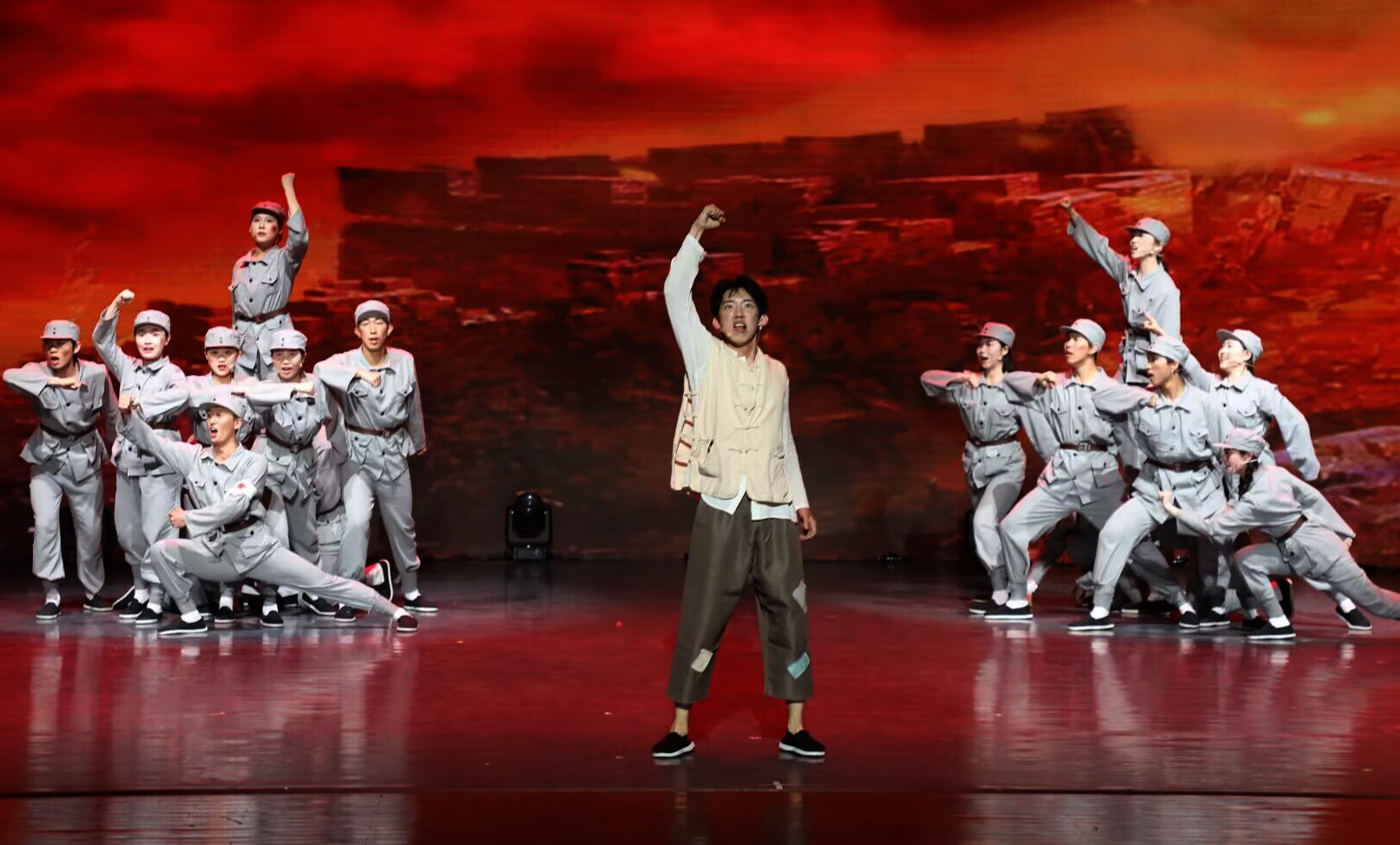 群舞《绿肥红瘦》和《日当午》,既有穿越诗词与古今娓娓道来的婉转柔美,又有农耕文化中坚韧不拔的磅礴力量。朗诵《我是一条古老的河流》歌颂了生命的不屈和顽强,笛子重奏《走进快活岭》和萨克斯重奏《Infinity》分别体现了中国传统乐器和西洋乐器的特色,在欢快悠扬的旋律展现了器乐教学演奏的成果。话剧《对话1933》和音乐剧《王二的长征》诠释了革命者的精神世界,讴歌了信仰的力量。京剧选段《状元媒》以婉转清越的唱腔展现了传统艺术穿越古今的魅力。