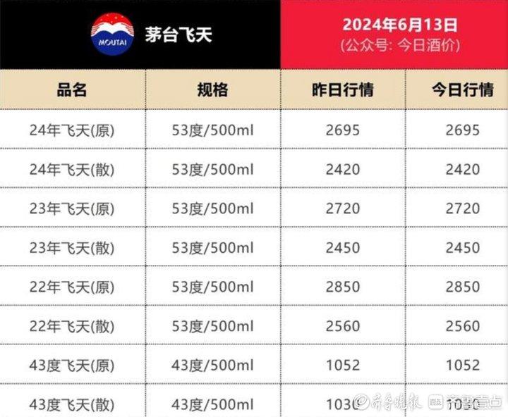至于飞天茅台线上售价,记者多平台比价后发现:截至6月13日,有的电商平台上飞天茅台散瓶的售价已经到了2280元一瓶,单瓶价跌破2300元。