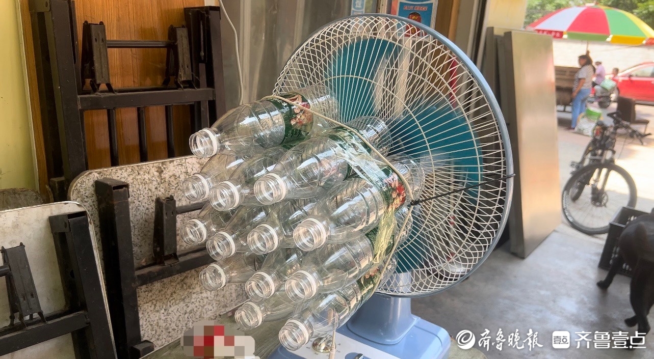 当日上午,记者路过一家炒鸡店,商家正在门口切鸡块,旁边的风扇格外不同,风扇上绑了13个空矿泉水瓶。“我是从网上学的,说是这样更凉快。”该商家说,他也是跟风试试,并不知道什么原理,“没有绑瓶子的风扇,扇的风是热风;绑上瓶子后感觉风是凉风,很神奇”。