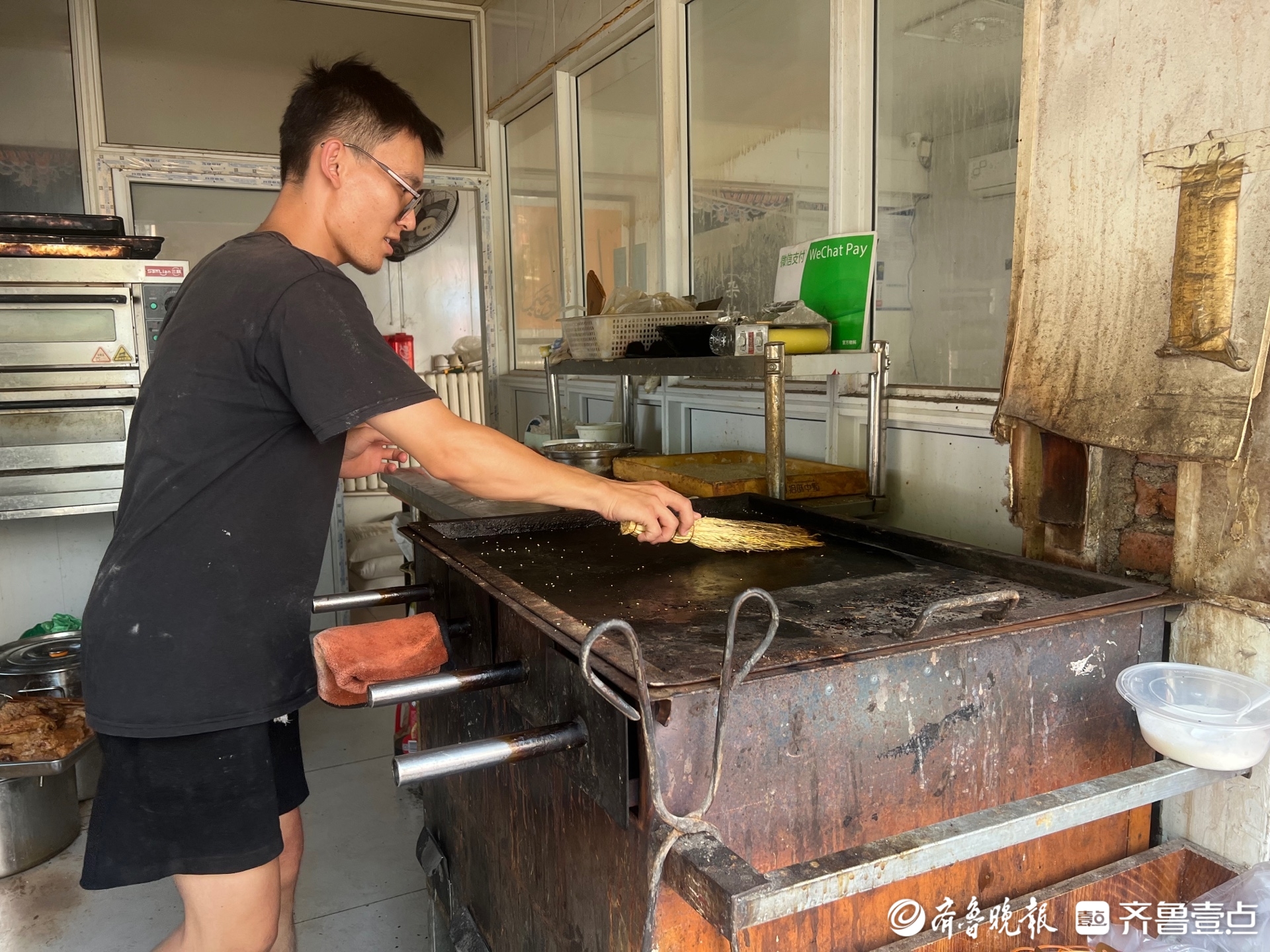 记者注意到,这家店并不小,整体也算通透,但记者仅在店内站了10分钟就已满头大汗。“我们没装空调,夏天就靠一个小风扇,现在还没开始烧炉子烤火烧,炉子开火后更烤人。”宋霖用挂在脖子上的毛巾擦了擦脸解释道,今天济南只有31˚C左右,风扇配合着屋外的微风,还没到受不了的程度。