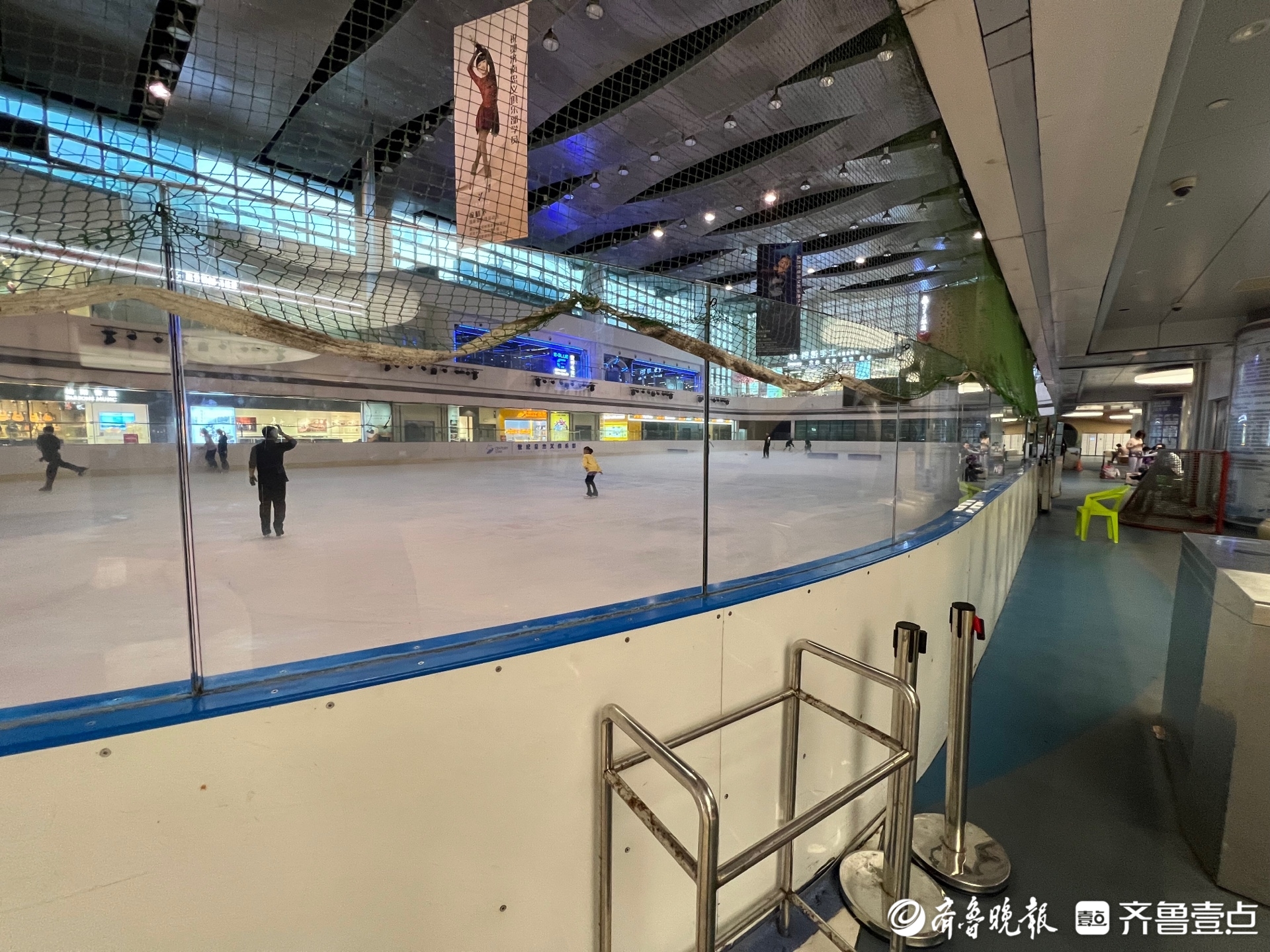 4日上午十点,记者来到济南贵和领秀城,此时商场内的滑冰场上有七八人在滑冰。有滑得比较好的老手,蹬冰、收腿、摆臂一气呵成;也有被搀扶着踱步的初学者,他们戴着头盔,身穿护具,小心翼翼地学习着。