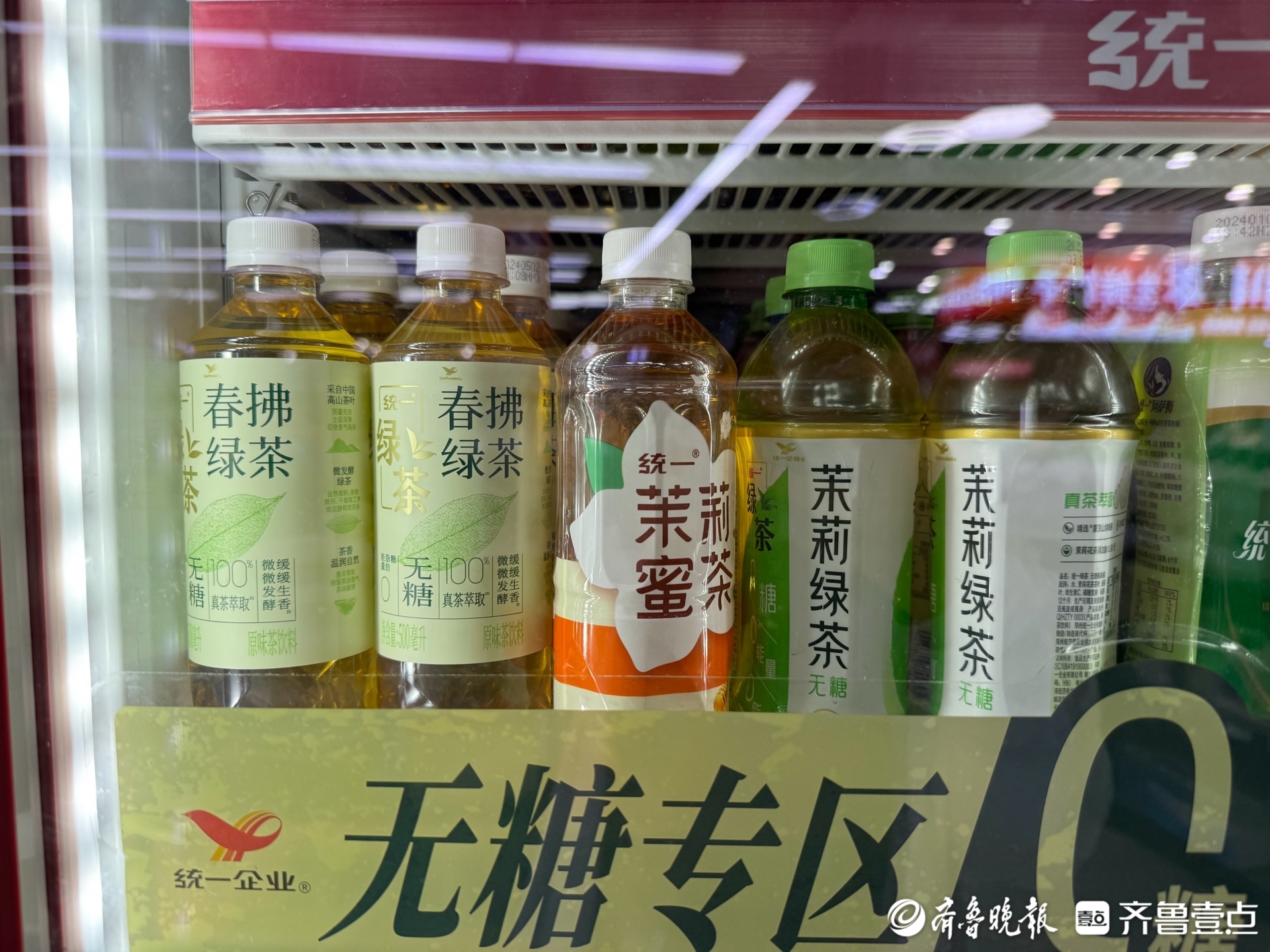 当日,记者在济南市泺源大街附近的橙子便利、便利蜂等多家便利店内看到,在冷藏柜中间显眼区域,集中摆放了各式各样的无糖茶饮,颇有店内主推产品之势。