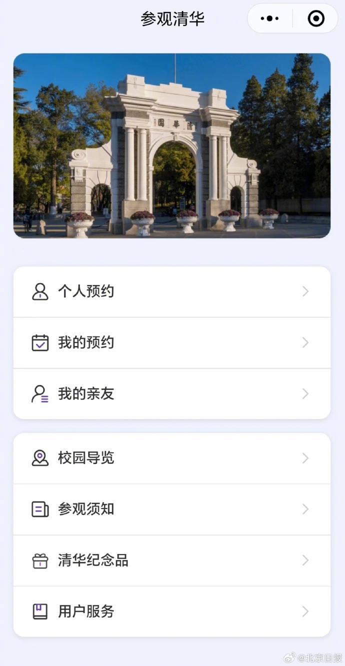 清华明确,校园参观实行网上实名预约,参观人员从指定校门出入。个人参观通过“清华大学”公众号——“参观清华”菜单进行实名预约。个人预约成功后,参观人员持身份证原件按预约时间从清华大学西门南侧个人参观专用通道经身份核验和安检后进校参观,参观结束后从西门出校。团队参观通过“清华大学”官方网站——常用链接——“校园参观”栏目进行预约。团队参观面向中小学生群体开放,预约主体为中小学或教育主管部门。团队预约成功后,持相关材料从清华大学东侧门经核验后统一入校,参观结束后从西门出校。