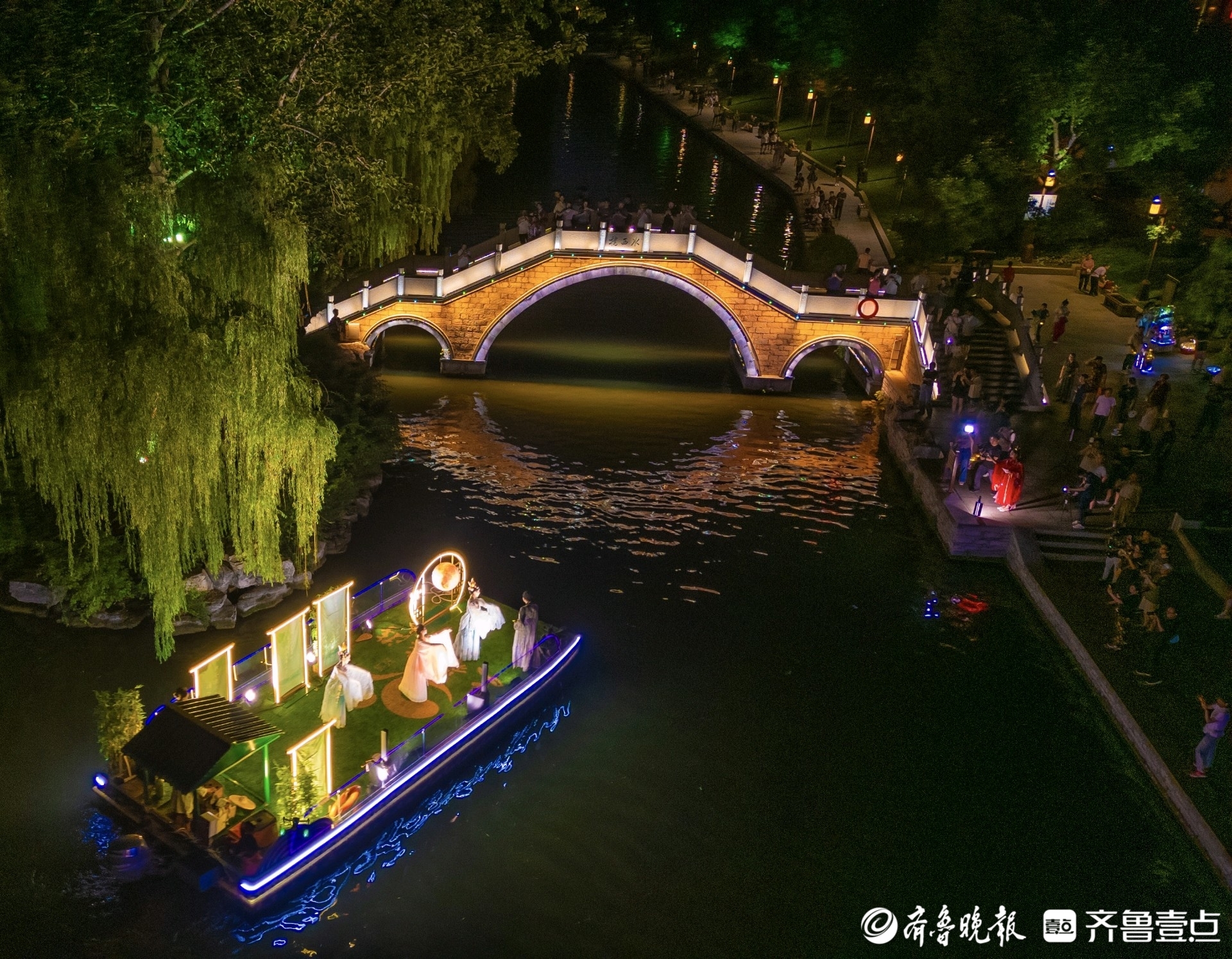 升级后的演艺以美感、艺术感十足的演出,将乾隆皇帝下江南、李清照明湖泛舟等脍炙人口的故事,展现在游客眼前。同时,演艺通过对历史人物的刻画,将济南的人文风貌进行展现。游客夜访明湖,不管是乘坐游船、湖边漫步还是桥头驻足,都能欣赏到这场视觉盛宴。