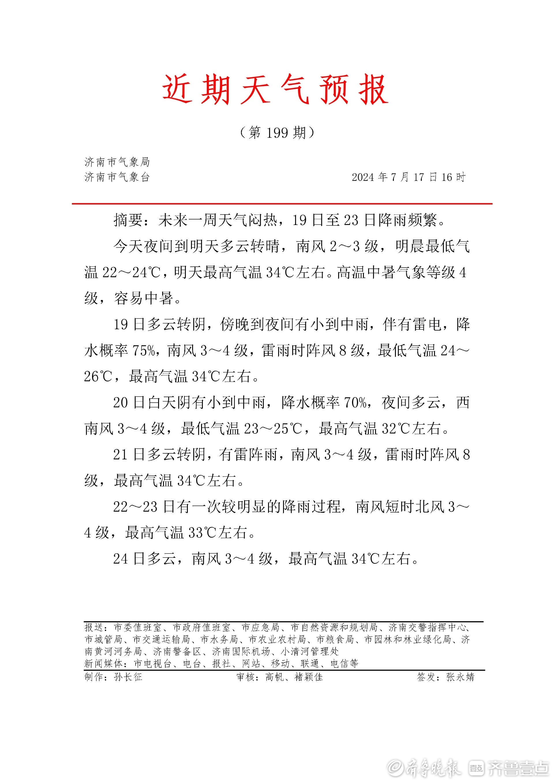 7月17日,记者从济南市气象台了解到,未来一周天气闷热,19日至23日降雨频繁。