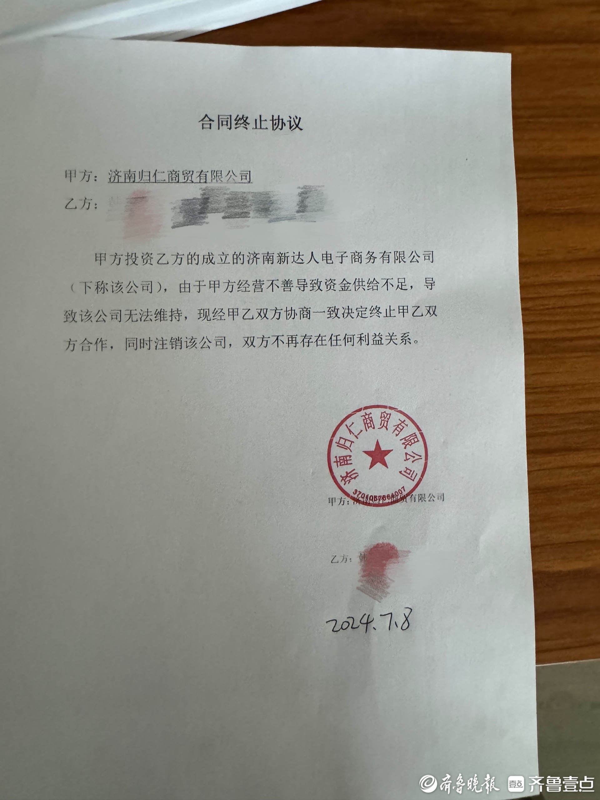 在一处办公桌上,记者发现一份合同终止协议。合同中显示,济南归仁商贸有限公司以“经营不善导致资金供给不足”为由终止其旗下济南新达人电子商贸有限公司,同时注销该公司。合同终止时间为2024年7月8日。记者通过“企查查”搜索发现,济南归仁商贸有限公司为山东归仁超市有限公司旗下全资控股子公司。而在今年7月3日,该公司已被济南市天桥区人民法院列为被执行人。