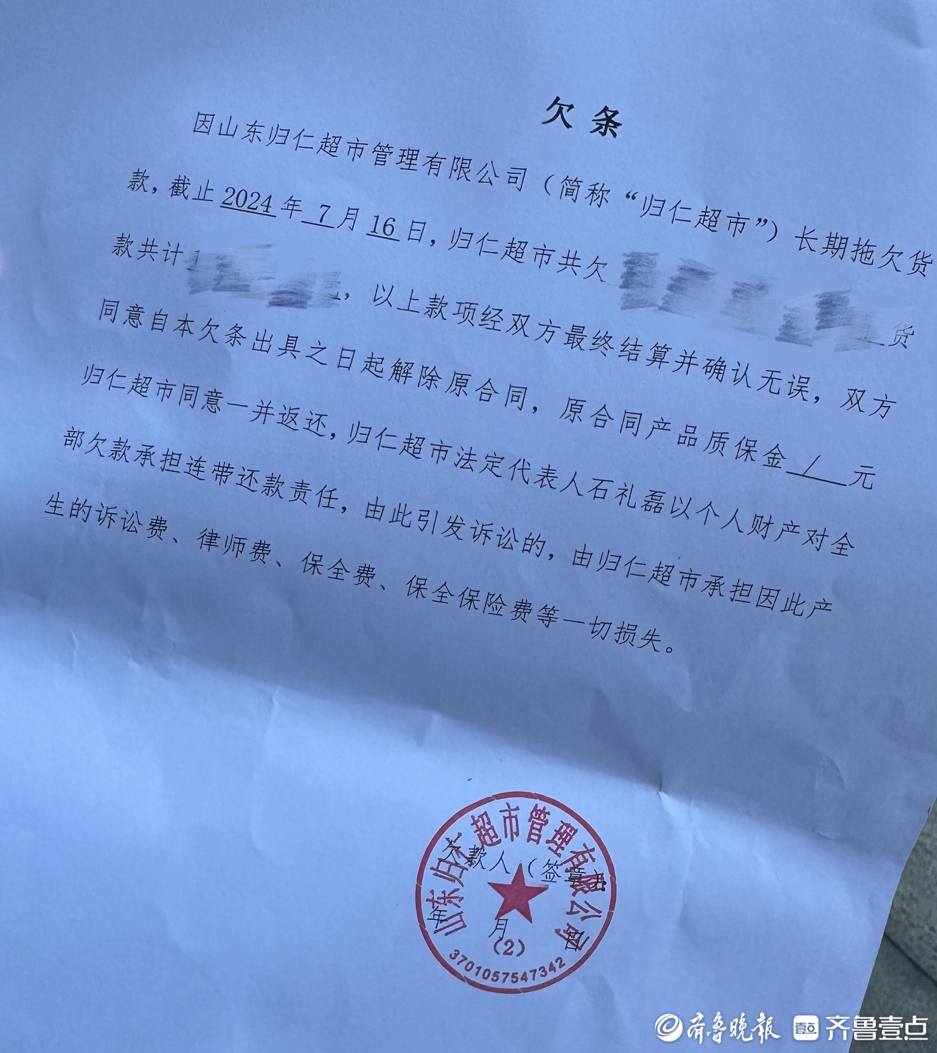 在知情人士指引下,记者在该路段周边找到了一位自称是公司采购负责人的男子,他表示,正在协调相关事情,同时他现场还为多位供应商打了欠条,上面落款盖着“山东归仁超市有限公司”的公章。