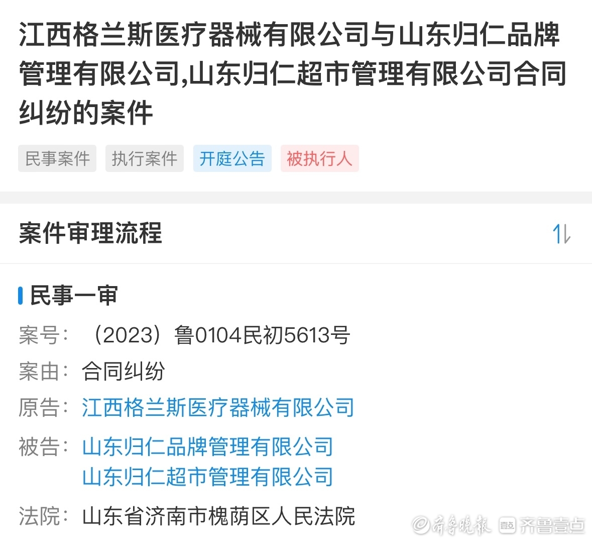 据了解,山东归仁超市管理有限公司成立于2019年,其法定代表人石礼磊,名下共关联18家企业,包含山东归仁生物科技有限公司、大理红糖世家食品有限责任公司等。其中山东归仁超市管理有限公司控股的多家公司曾因买卖合同纠纷被诉至法院。