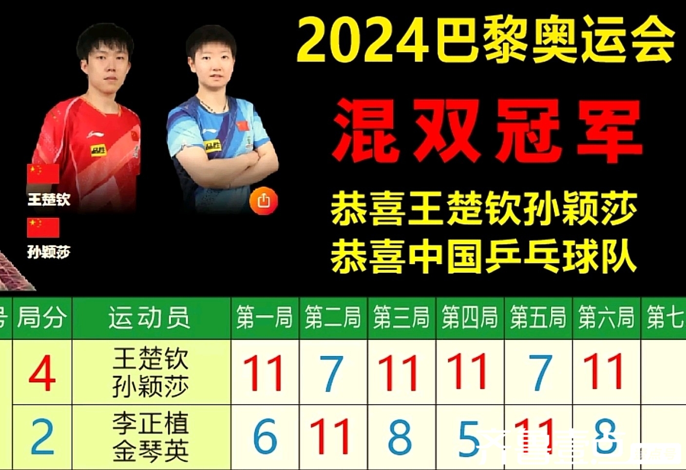 7月30日晚8:30开始,巴黎奥运会乒乓球首个冠军混双决战比赛,现场成了中国队的主场加油气氛。隔着屏幕,更是吸引了无数国人的关切。王楚钦/孙颖莎混双组合对战朝鲜组合李正植/金琴英,以超群的实力4:2获胜。祝贺莎头组合摘取了沉甸甸的冠军奖牌。
