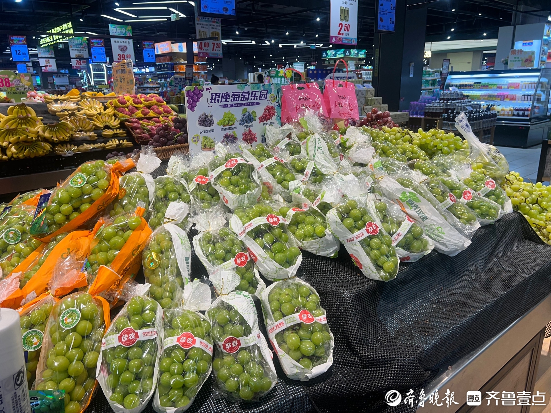在银座超市(北园)店内,各式各样的葡萄摆放在展柜上,其中,维多利亚葡萄9.9元/斤,红提大果6.99元/斤,阳光玫瑰16.8元/斤。“现在买挺合适,之前是29.9元/斤,因为没货了搞活动,或者月底来买也行,也会降价促销。”工作人员介绍。