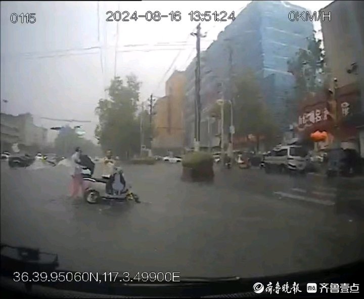 据了解,8月16日13时50分左右,董雷驾驶车辆在解放路燕子山路路口等待信号灯时,一位女士骑着电动车过马路,由于路面水流很急,女士快要骑到马路中央时不慎摔倒,沉重的车身让她一时难以将车扶起。