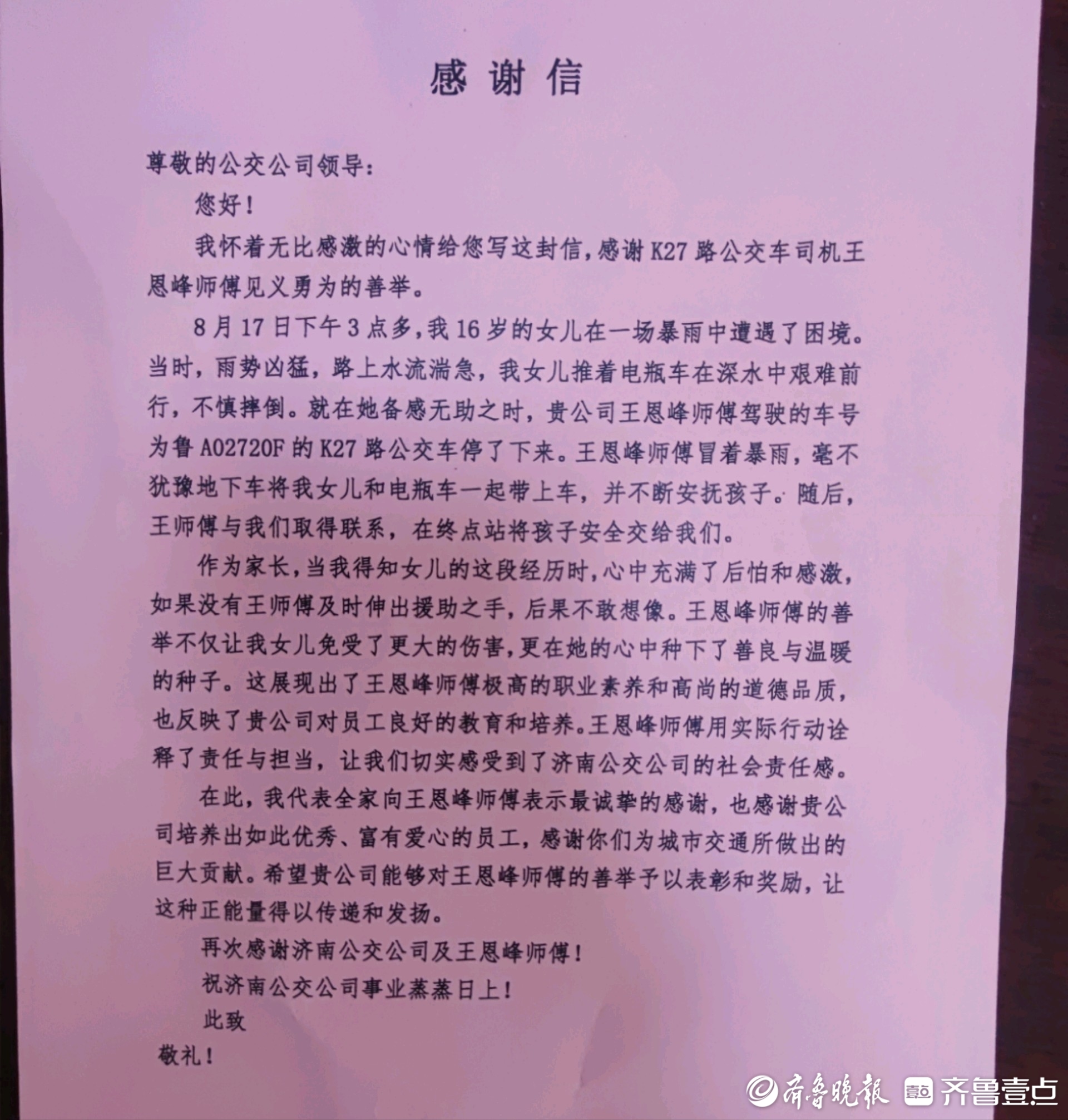 “在她备感无助时,贵公司的公交车停了下来。”8月18日,济南市民李先生向济南公交西部分公司发来感谢信,感谢驾驶员在暴雨中救助了他被困的女儿。