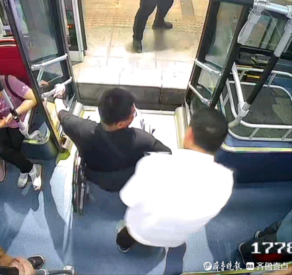 左新忠跑到后门时,坐轮椅的乘客已经快要靠近车辆,但站台边缘空隙让他一时不敢直接过去。此时,站台上的一位热心市民赶忙上前帮忙。左新忠与热心市民一前一后,将轮椅抬起,帮助乘客上车。在这一过程中,车内的其他乘客并没有因为绿灯而催促驾驶员赶快出发,而是安静地等待坐轮椅乘客上车。