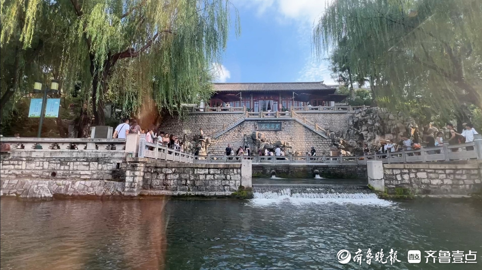 一水绕城、碧带环郭、清泉长涌、绿树相映,护城河吸引了众多市民游客在此戏水纳凉,附近不少居民携带水桶在黑虎泉边的接水点排队接水,游客在树荫下赏泉拍照,享受冰凉泉水带来的小气候。