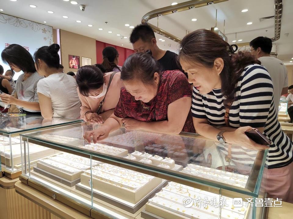 市民和游客在招远黄金珠宝首饰城内选购黄金饰品。