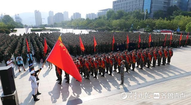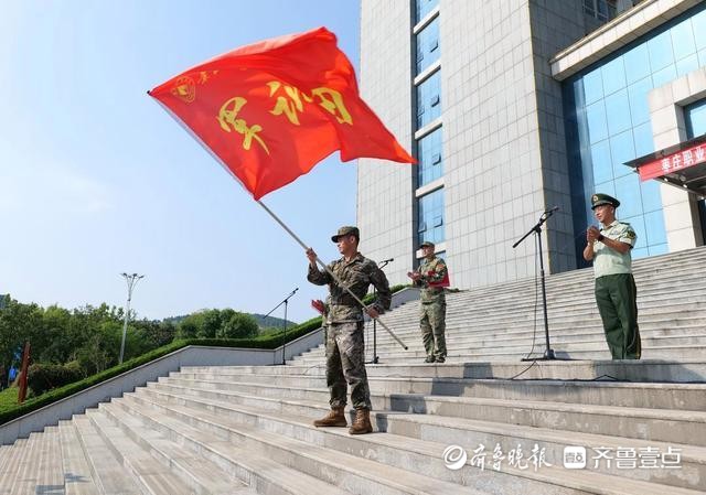 军训动员大会上,新生代表和教官代表进行了发言。李永富为军训团授旗。