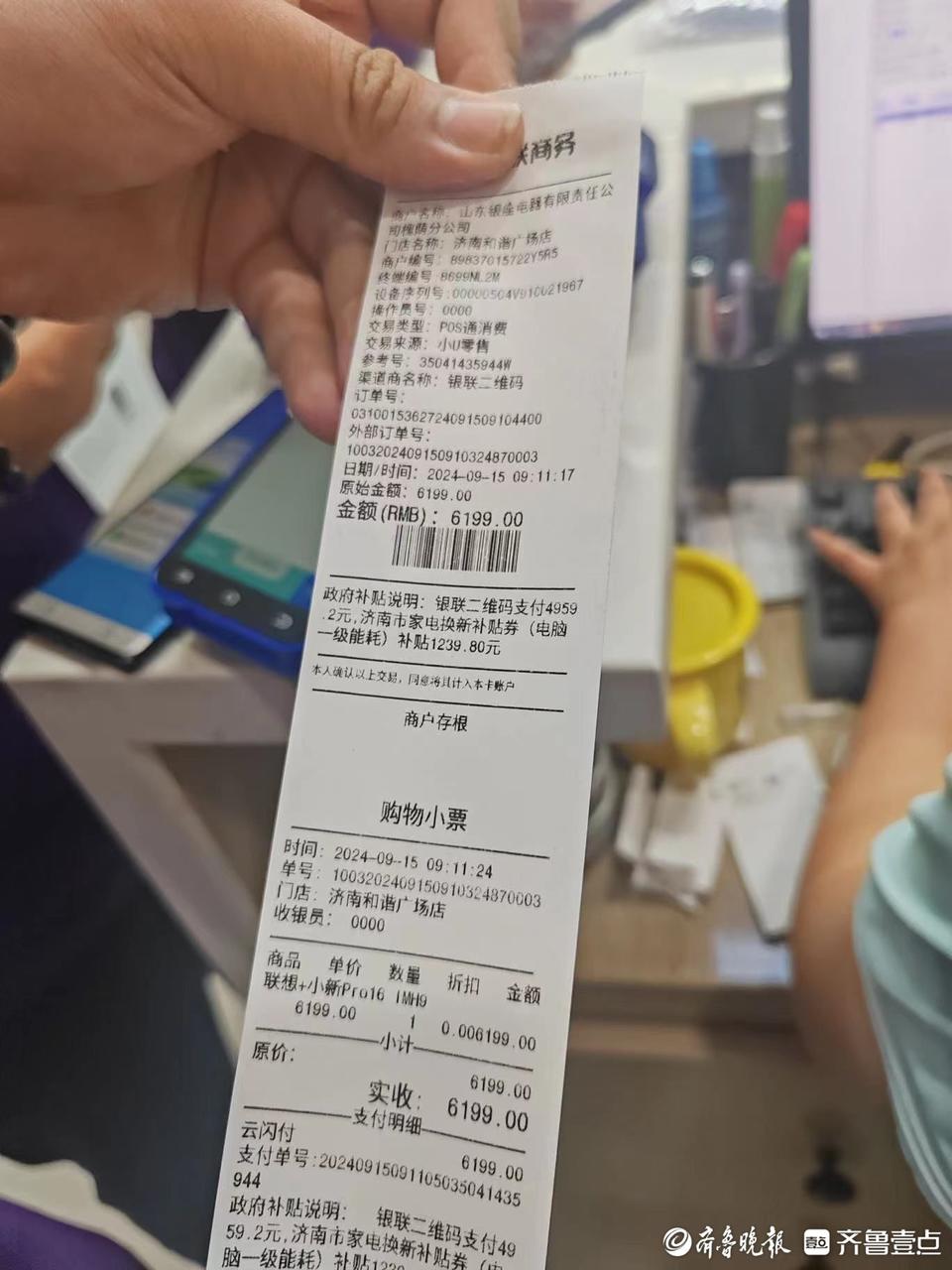 据银座电器和谐广场店工作人员介绍,顾客购买联想小新PORO16笔记本,销售指导价6499,银座金九月活动叠加优惠300元,即成交价6199元,消费者在此基础上抢领政府以旧换新补贴,获得以旧换新补贴1239.8元,消费者实际付款4959.2元,节省1539.8元。