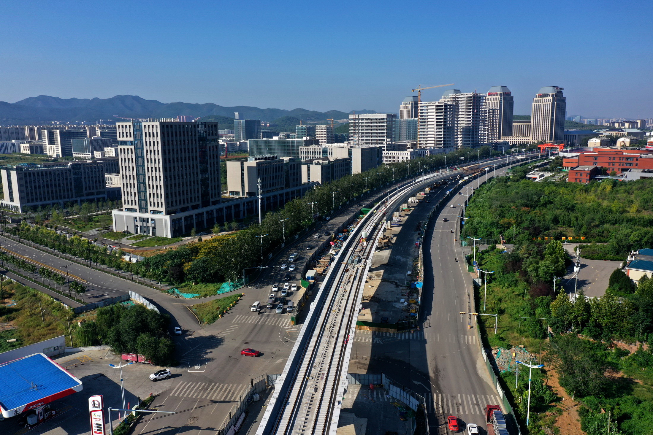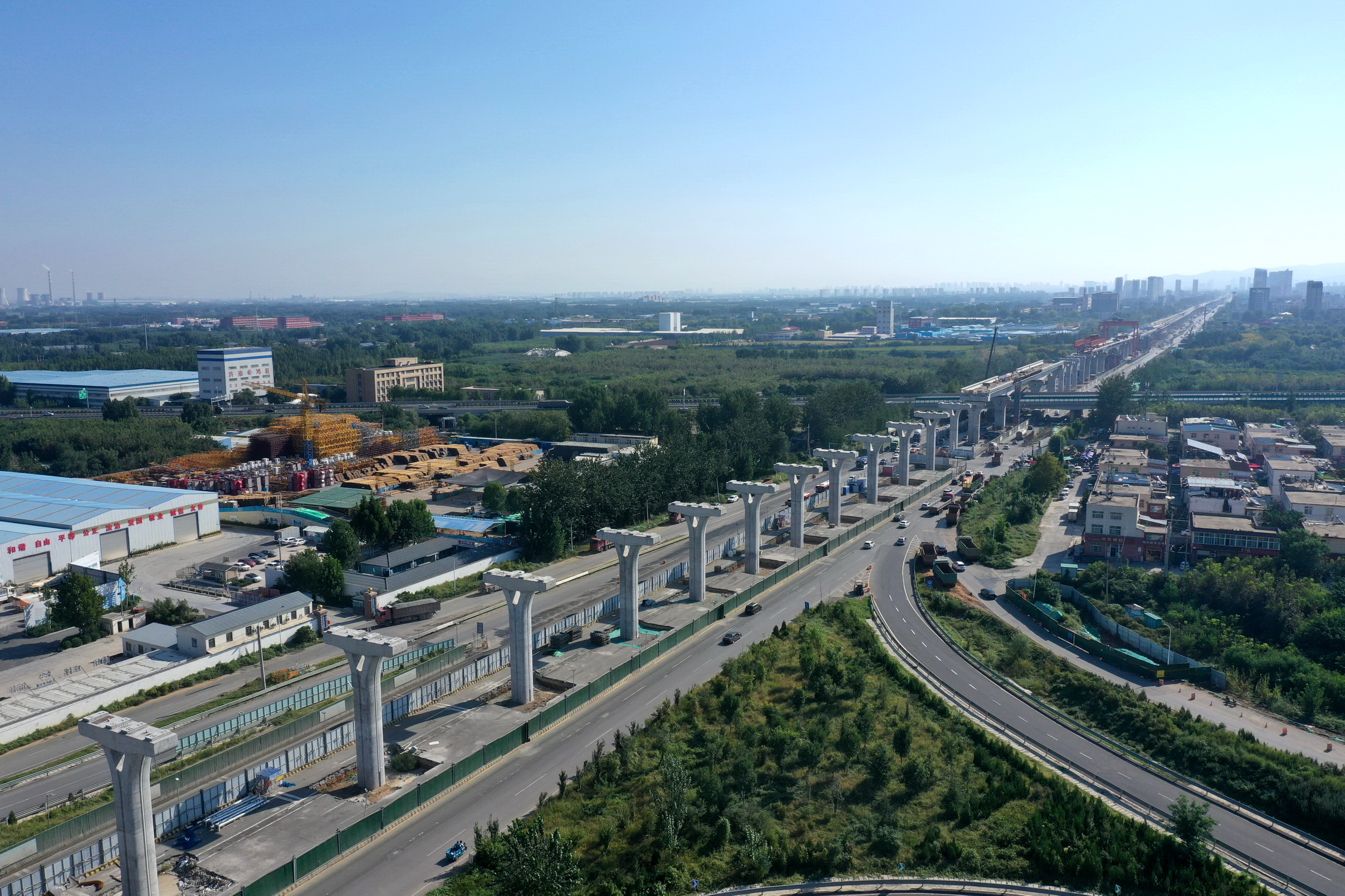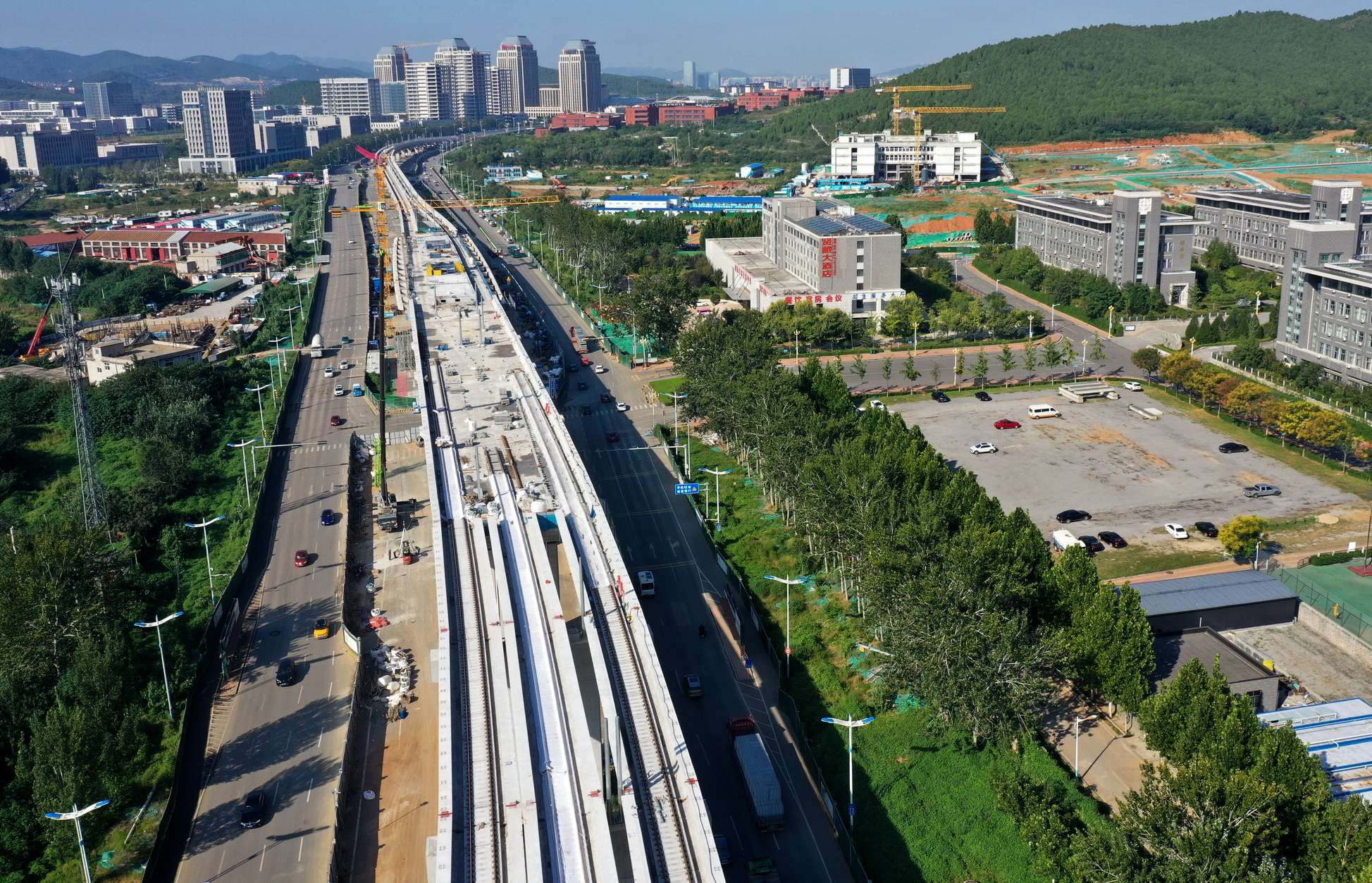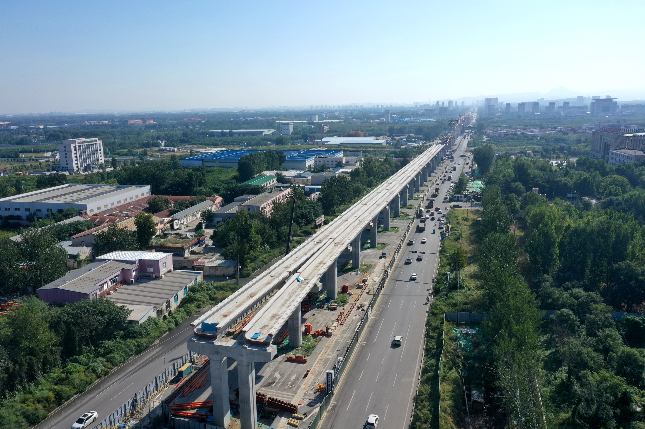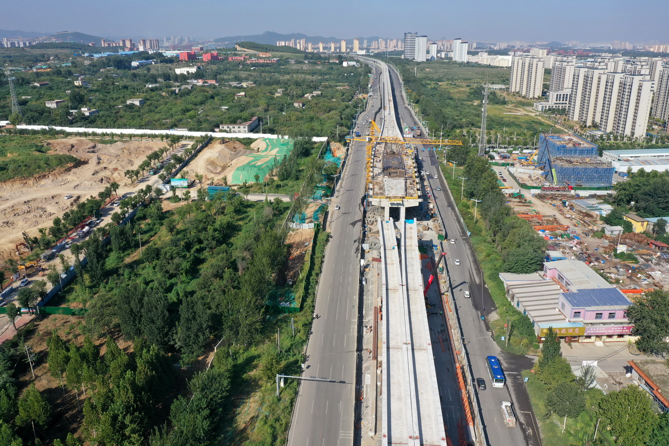 中秋假期,航拍济南轨道交通8号线。空中可见大部分高架路已经完成连续粱施工,少部分墩柱上方即将架梁。 有近2500人奋战在工地上,全力保障全线按时通车。 据介绍,济南轨道交通8号线地下段共3座车站,目前已全部封顶。高架段架梁、铺轨、接触网支柱、声屏障施工同步进行。全线38联连续梁,已合龙37联。 (大众新闻·齐鲁壹点客户端记者 周青先 )
