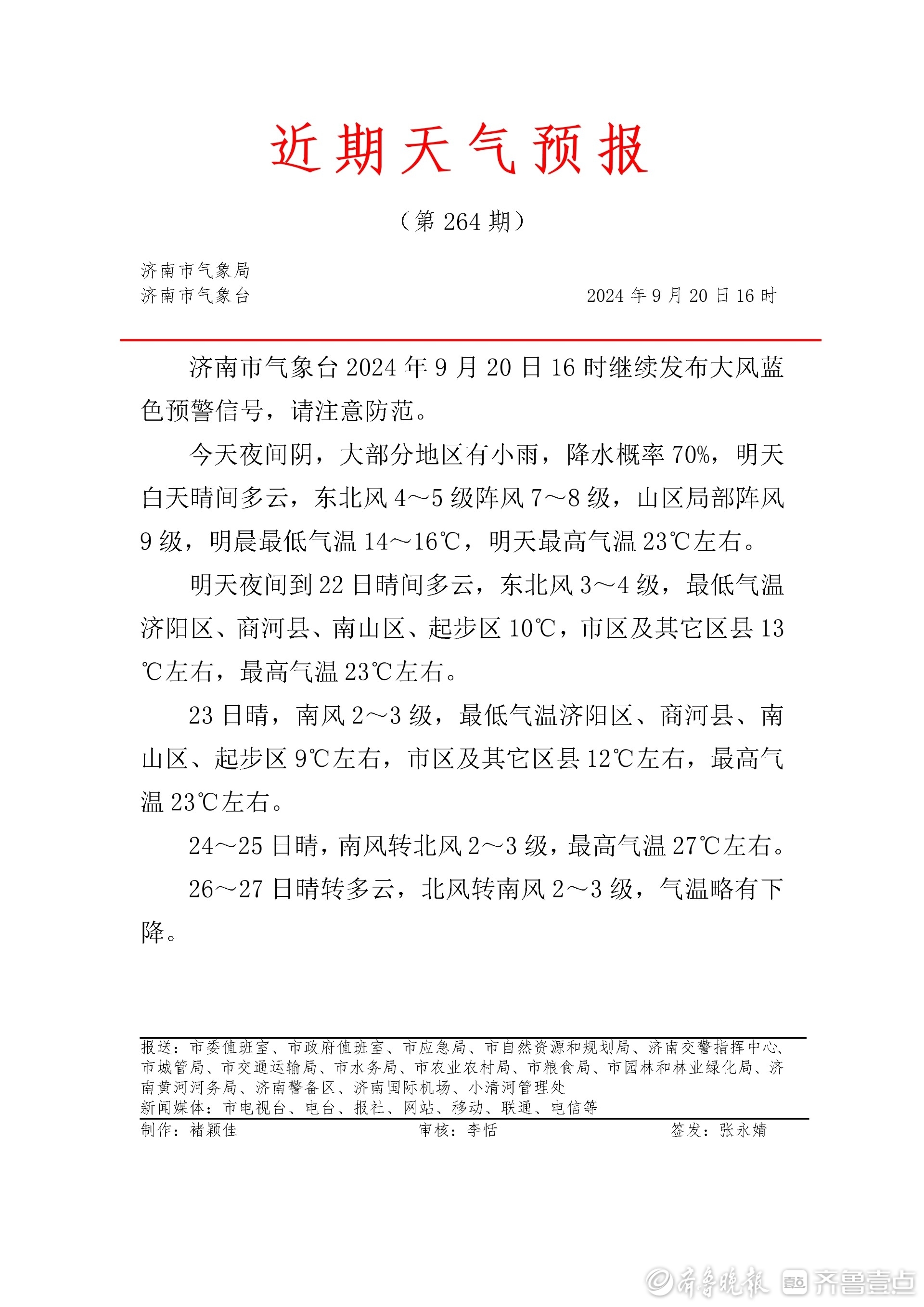 根据济南市气象台发布的分县预报:20日夜间阴,大部分地区有小雨,降水概率70%,21日白天晴间多云,东北风4~5级阵风7~8级,山区局部阵风9级,21日晨最低气温14℃~16℃,21日最高气温23℃左右。