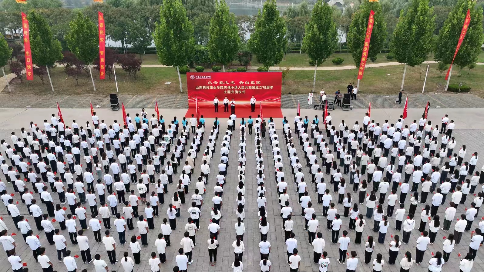 9月30日,山东科技职业学院在办公楼前广场举行“以青春之名告白祖国”庆祝中华人民共和国成立75周年主题升旗仪式,学校党委书记郑德前,党委副书记、校长刘福玉,党委委员、副校长董传民,各部门党政负责人及各系师生代表近1000人共同为伟大祖国庆生。仪式由党委副书记李保城主持。