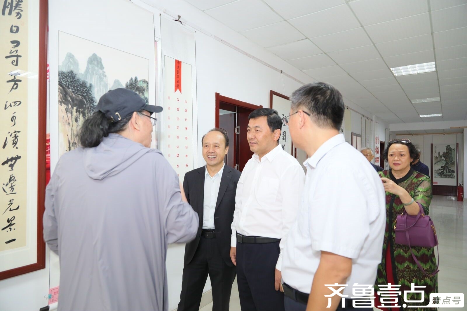 随后,梁洪峰宣布书画展开展。许记中、周颜玲同参加开展仪式的部分退休老同志、离退休工作处党委各支部书记、参展作者以及宣传部、离退休工作处、和平校区管理办公室、设计集团等单位人员共同参观了展览。许记中、周颜玲与退休老同志和参展作者亲切交谈,就作品的创作背景、创作技法、观展体会等进行了深入交流。