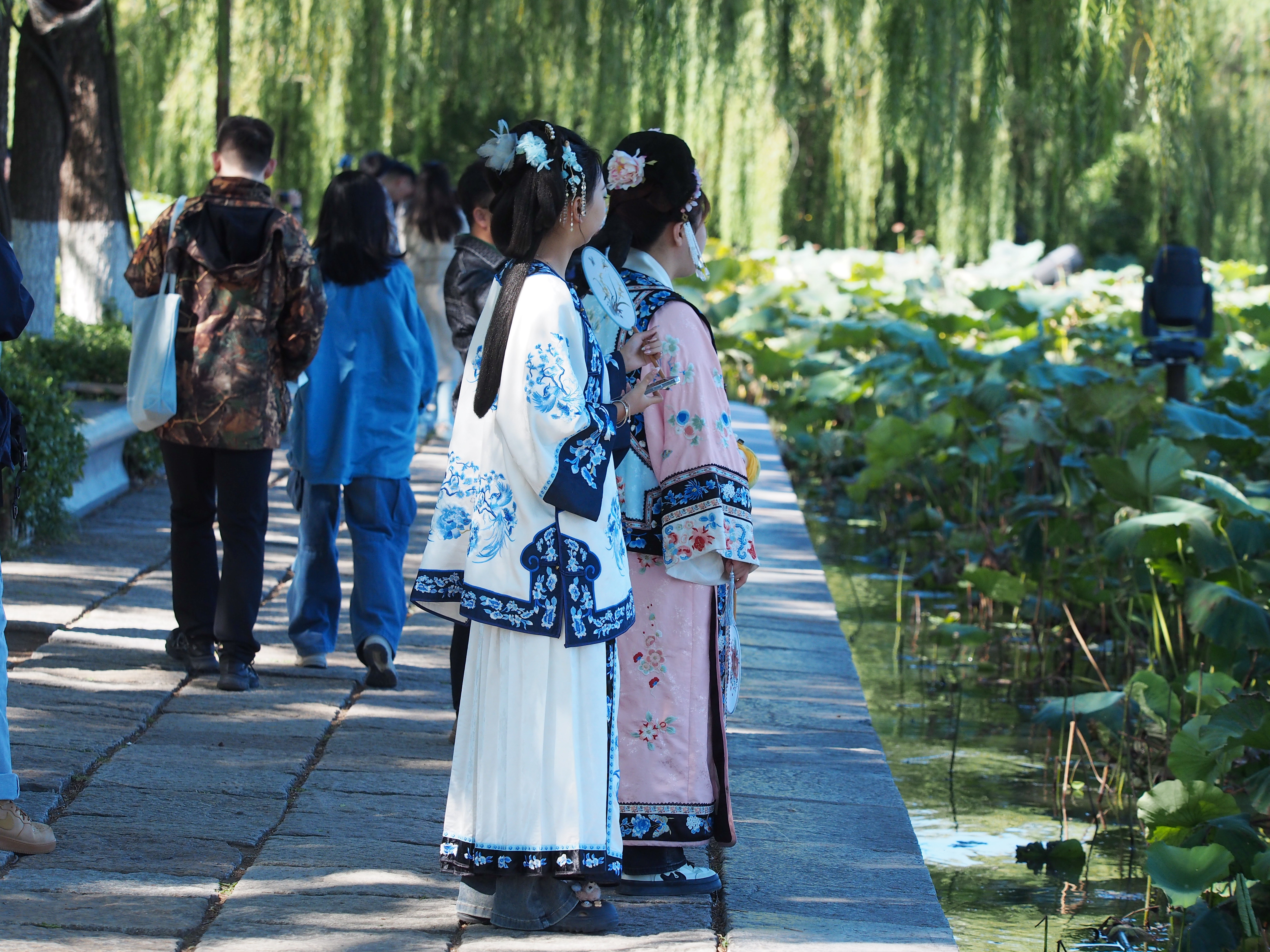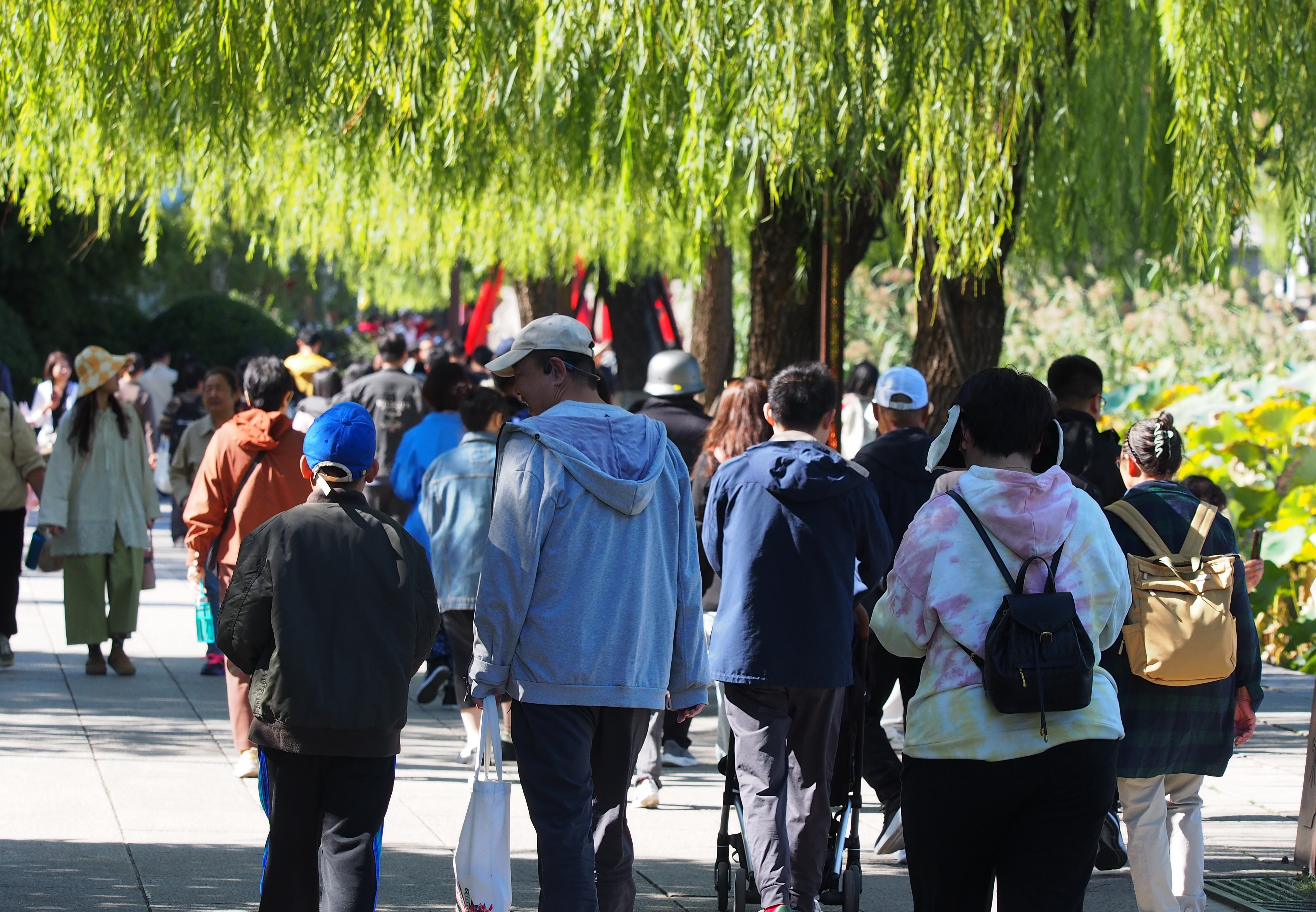 大批本地和外地游客赶赴泉水景观区大明湖,沿着湖岸绕圈赏景,其乐融融。