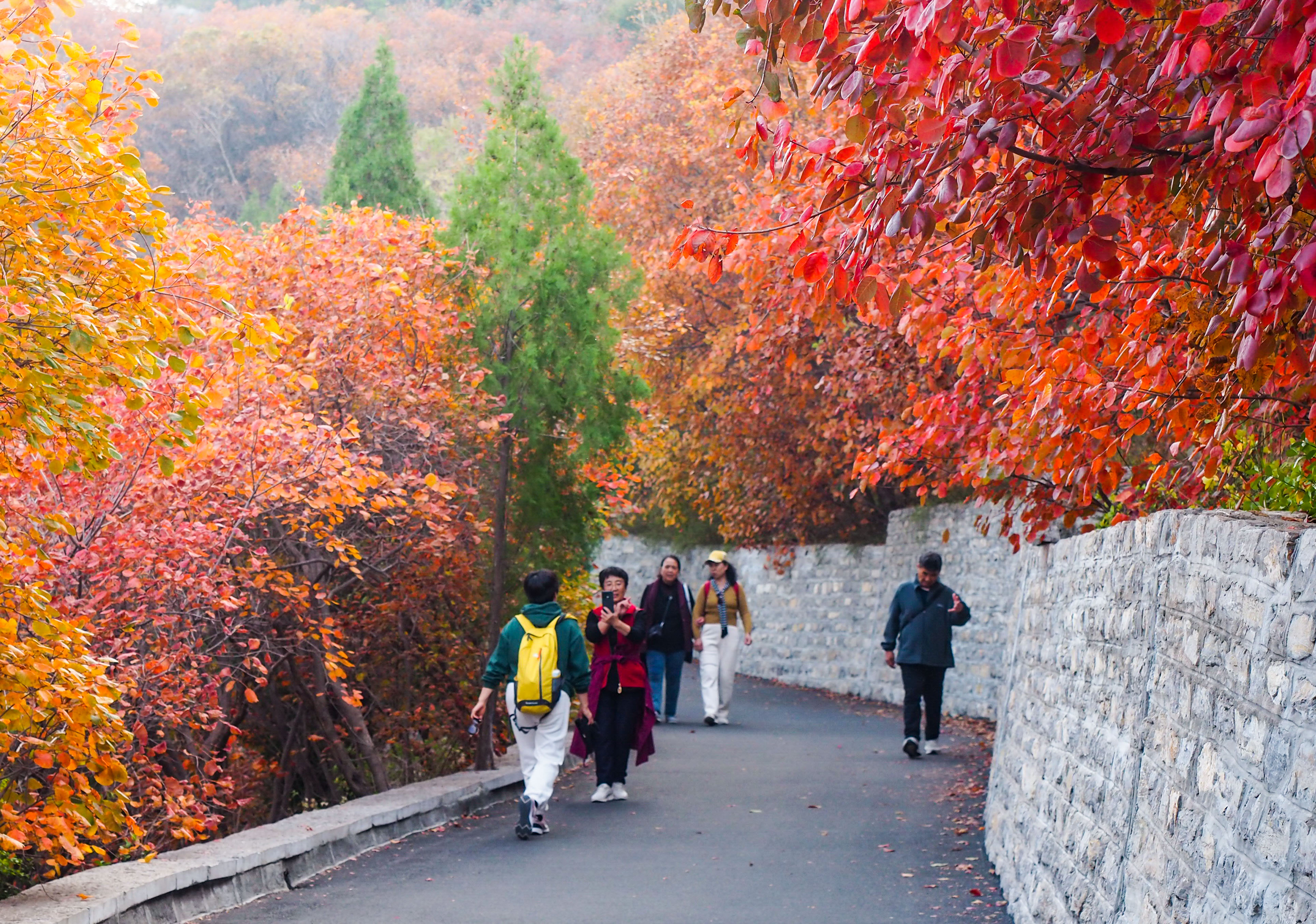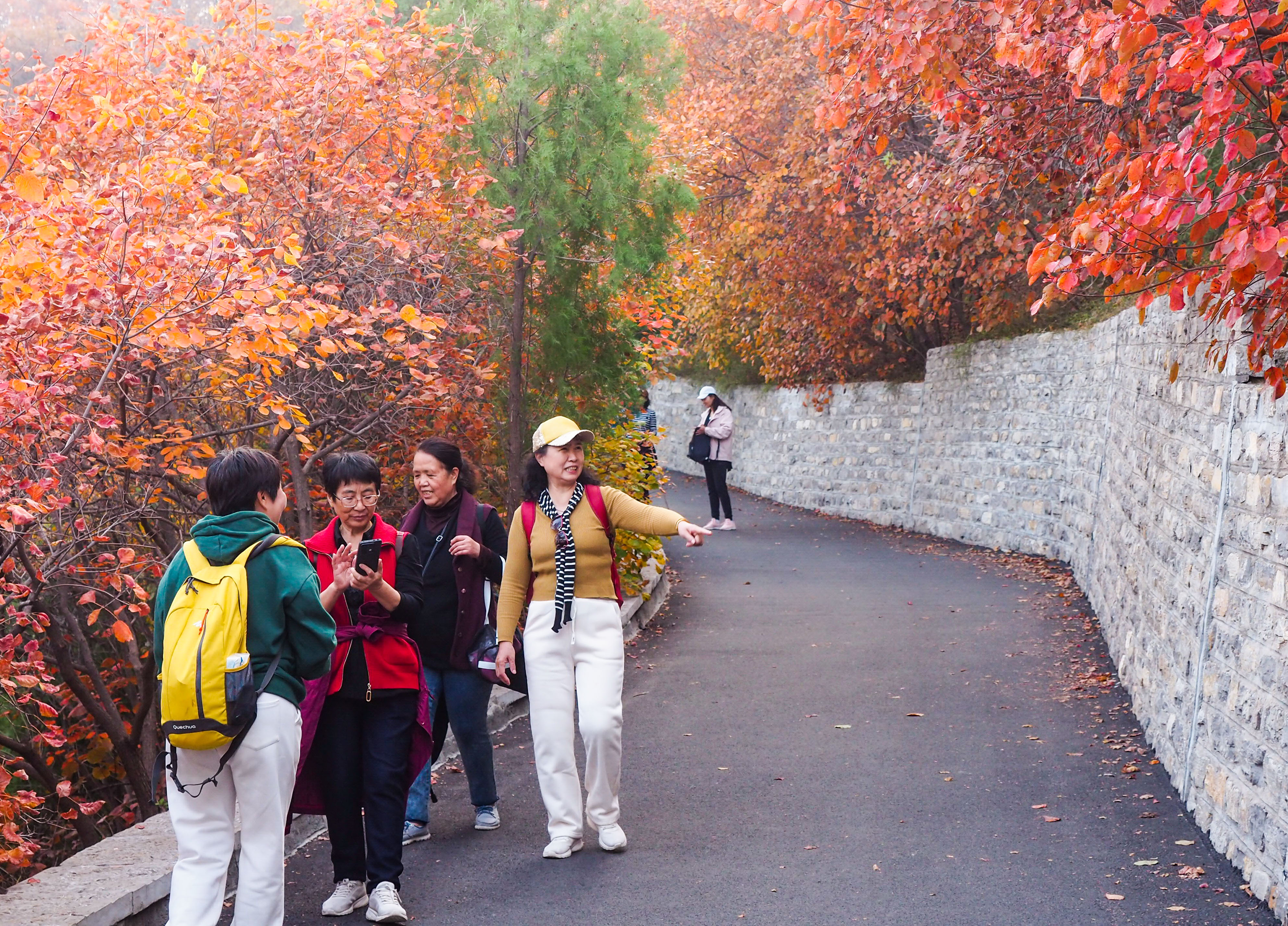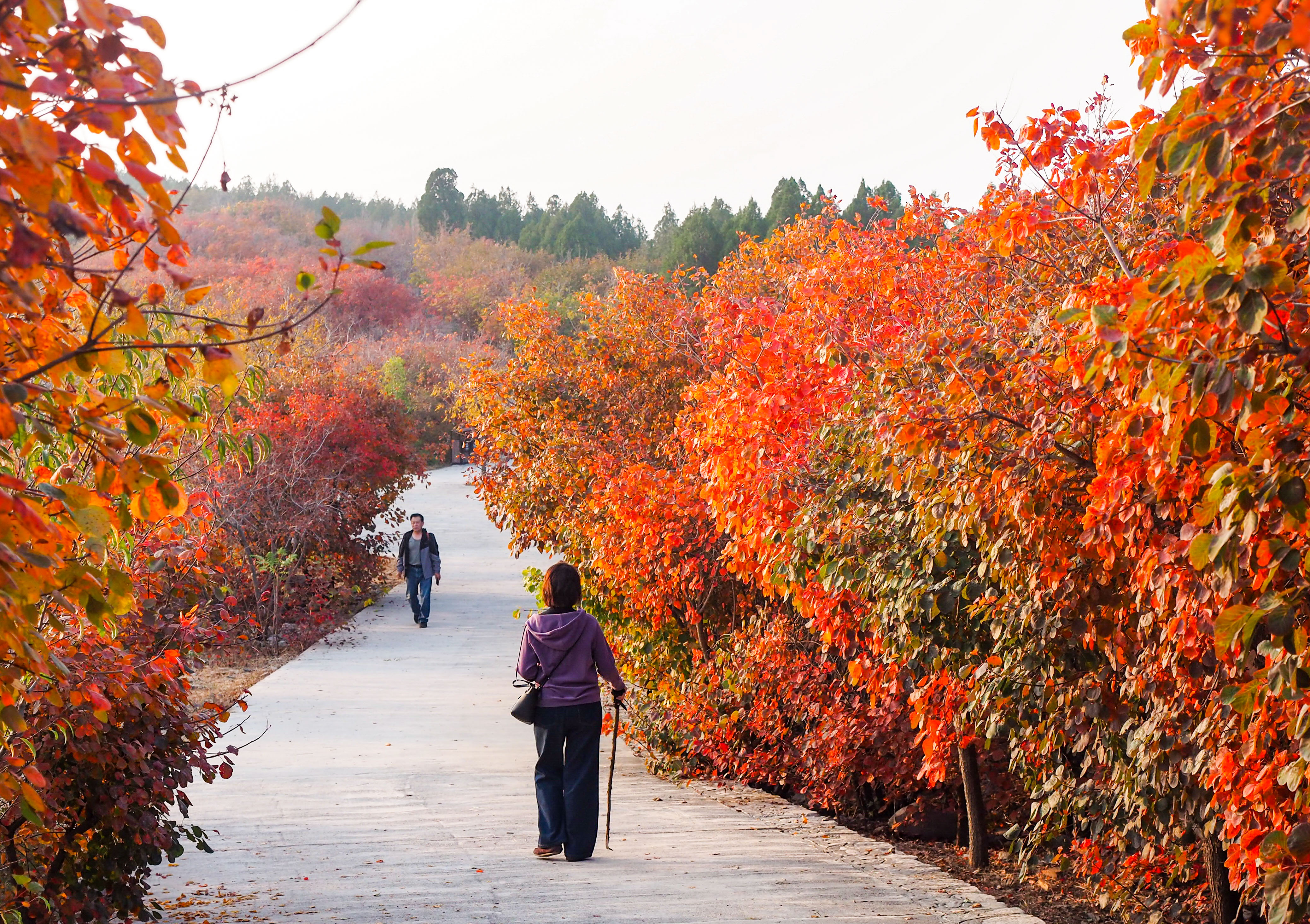10月29日,济南秋阳灿烂。南外环附近的蚰蜒山东南侧山体红彤彤一片。 大面积黄栌已经红透,景色非常火热喜庆。大批市民结伴前来欣赏秋色,沉浸在红色的深秋中不舍离去。 (大众新闻·齐鲁壹点客户端记者 周青先)