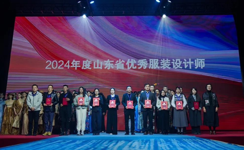 周锦、中国时装评论委员会主任委员陈建力为“2024山东省优秀服装设计师”颁奖。山东服装职业学院参赛选手服装设计与表演系教师薛伟获“2024山东省十佳服装设计师”奖。