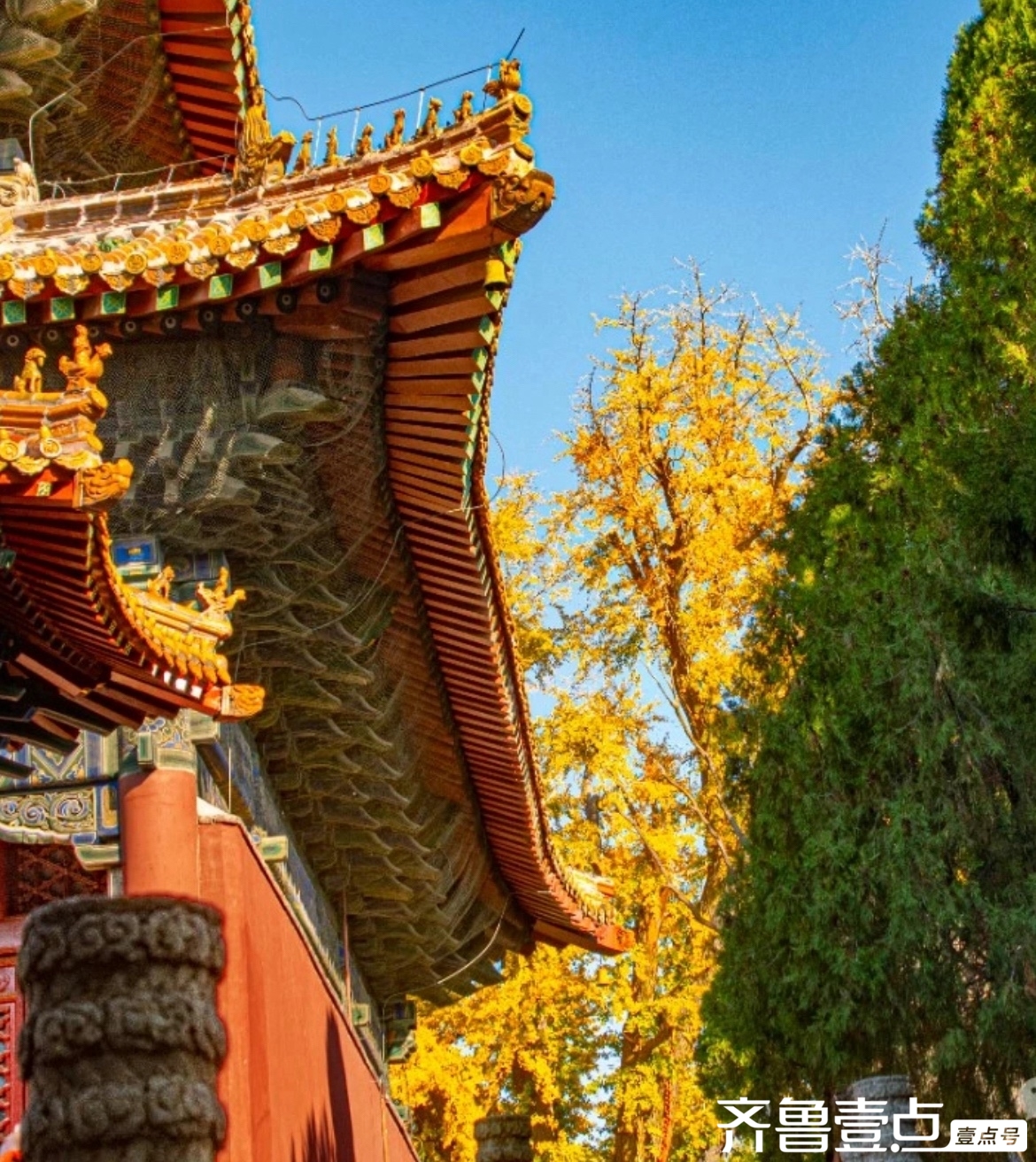 庭院内,银杏金黄,松柏青翠,柿子红艳。烂漫的秋色,如诗如画,令人心醉。蔚蓝的天空下,庄严的古建筑与绚烂的秋花秋叶相互映衬,编织出秋末冬初最为秀美的风景线。