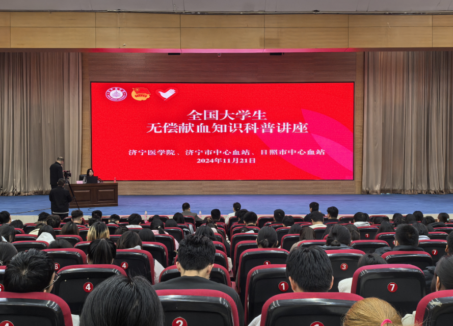 11月21日,由济宁医学院联合济宁市中心血站、日照市中心血站主办的全国大学生无偿献血知识科普讲座在济宁医学院太白湖校区举办。
