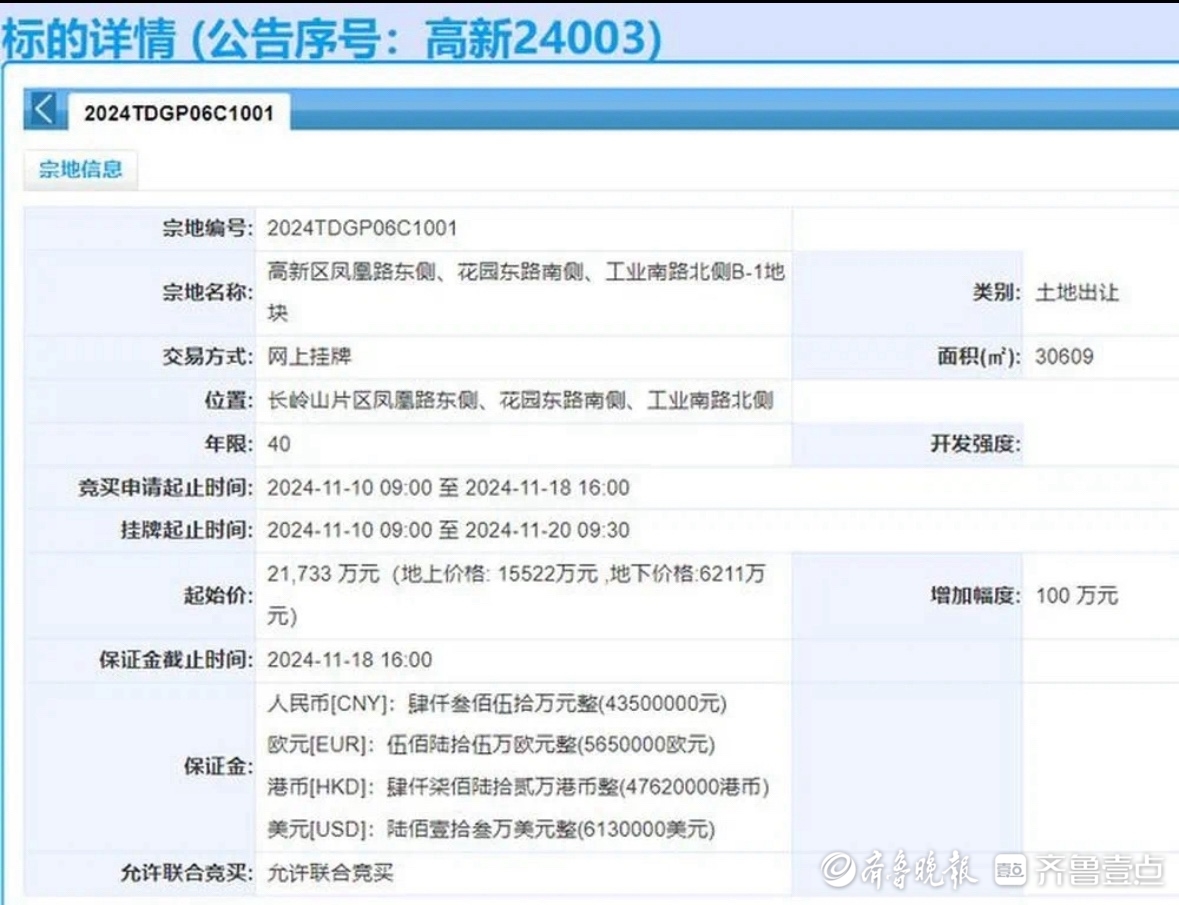 根据挂牌文件,高新区凤凰路东侧、花园东路南侧、工业南路北侧B-1地块规划用地性质为商业用地,规划建设用地地上容积率大于0.7、不大于1.0,地下容积率最大2.0,出让年限40年,出让起始价21733万元。该项目总投资不低于5亿元,在《土地出让合同》签署后1年内开工,开工后3年内竣工。