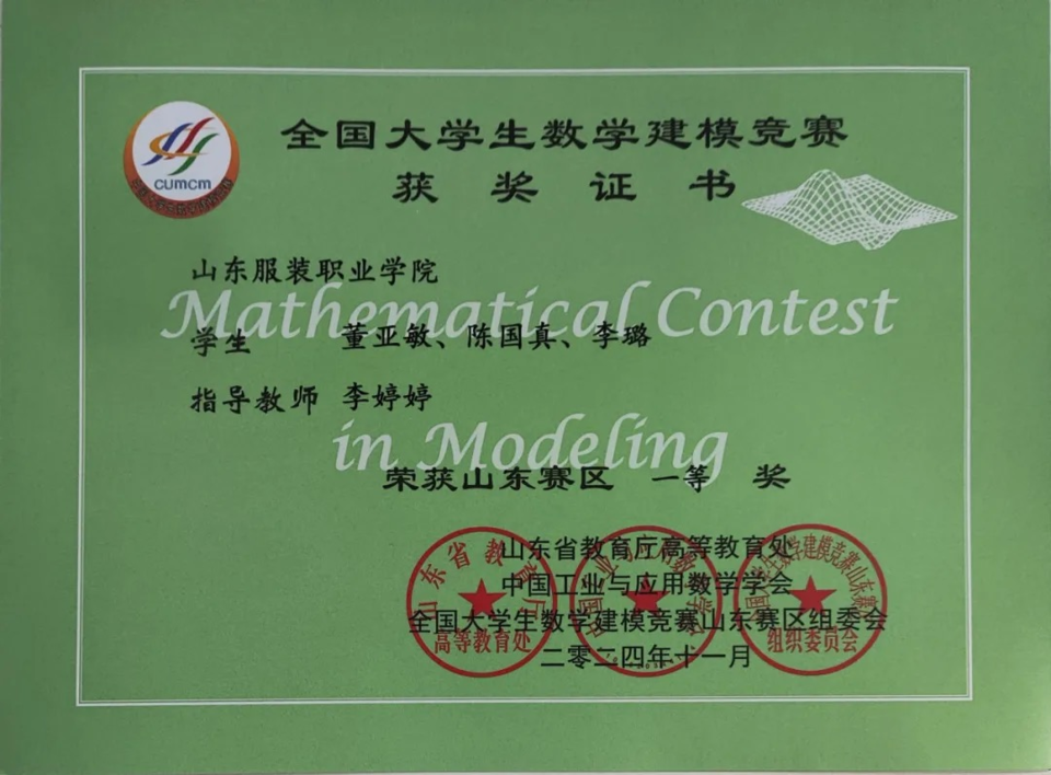 在2024年度全国大学生数学建模竞赛山东赛区竞赛中,山东服装职业学院两支队伍获山东省一等奖。据悉,山东赛区共有119所学校、4418支队伍报名参赛。
