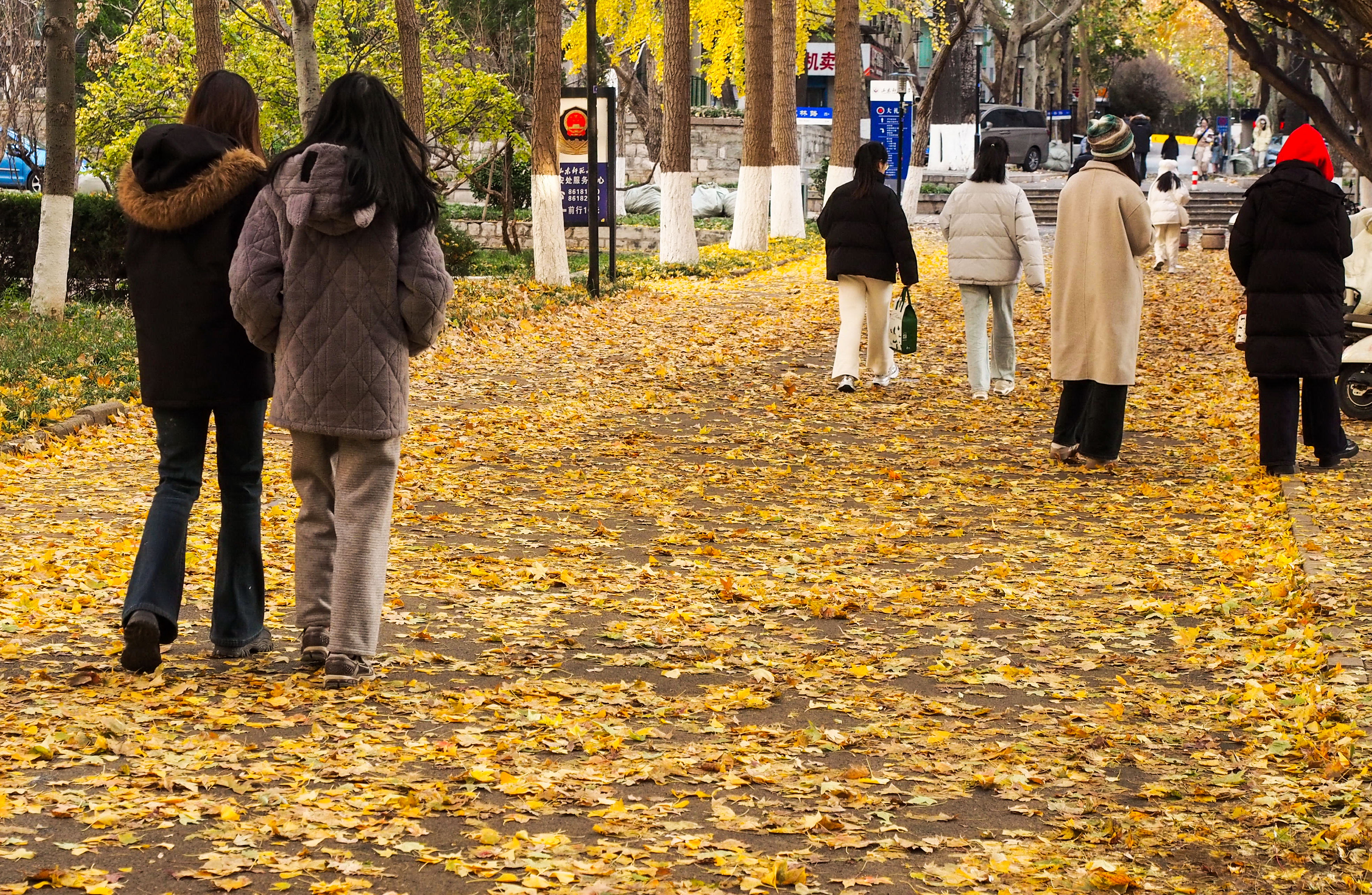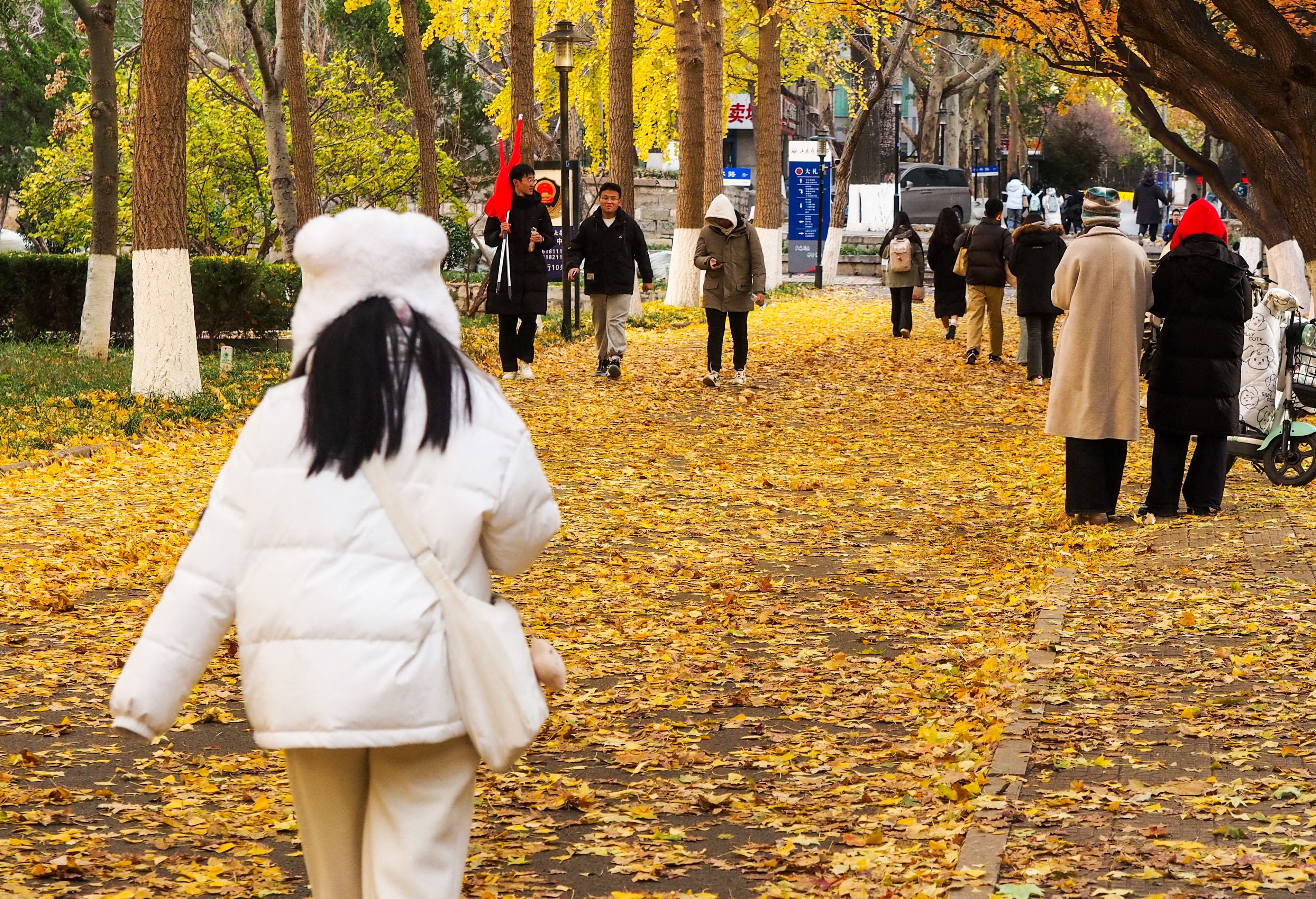 齐鲁晚报·齐鲁壹点记者 周青先 11月26日,济南街头北风凛冽,强劲的北风正在扫落最后一批树叶,山东师大校园内金色落叶满地,形成美丽的图案。 入冬的强寒潮首次将气温降到0℃以下,当日早晨济南最低气温达到-3℃。