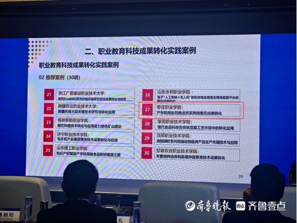 “产教融合人才培养”分论坛由中国职业技术教育学会主办,论坛发布与推荐了来自19个省、自治区、直辖市职业院校的职业教育产教融合科技成果转化100项实践案例,枣庄职业学院农学系、化工与制药系牵头申报的《产学研用协同推进药茶两用菊花成果转化》《校企技术创新平台助力新型催化材料技术转化》两项案例成功入选,特别是农学系黄振老师的《产学研用协同推进药茶两用菊花成果转化》被组委会-中国职业技术教育学会列入30项重点推荐案例。中国职业技术教育学会会长、教育部原副部长鲁昕在主旨报告中对枣庄职业校推荐案例进行了推介展示,并为学校入选案例颁发证书。
