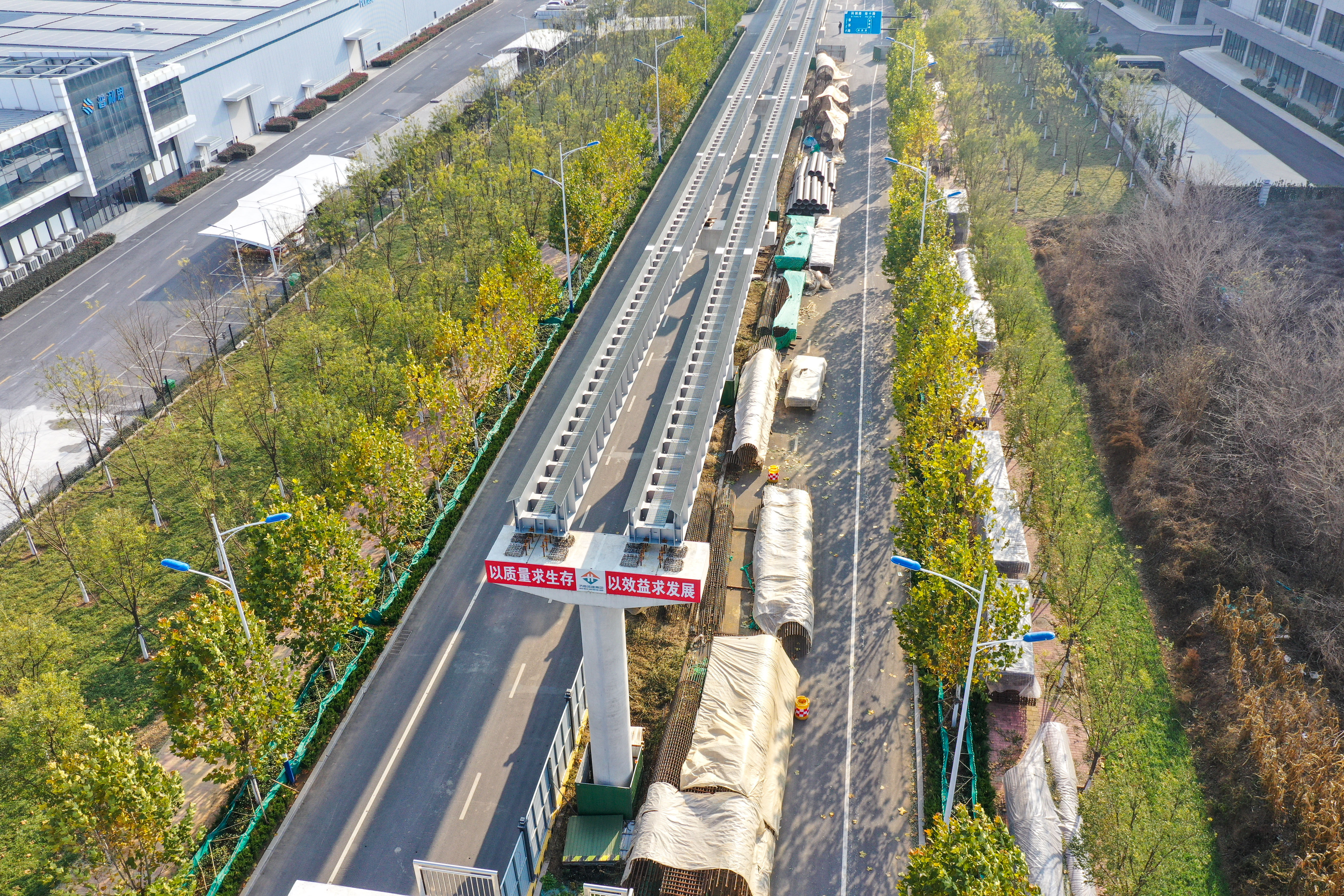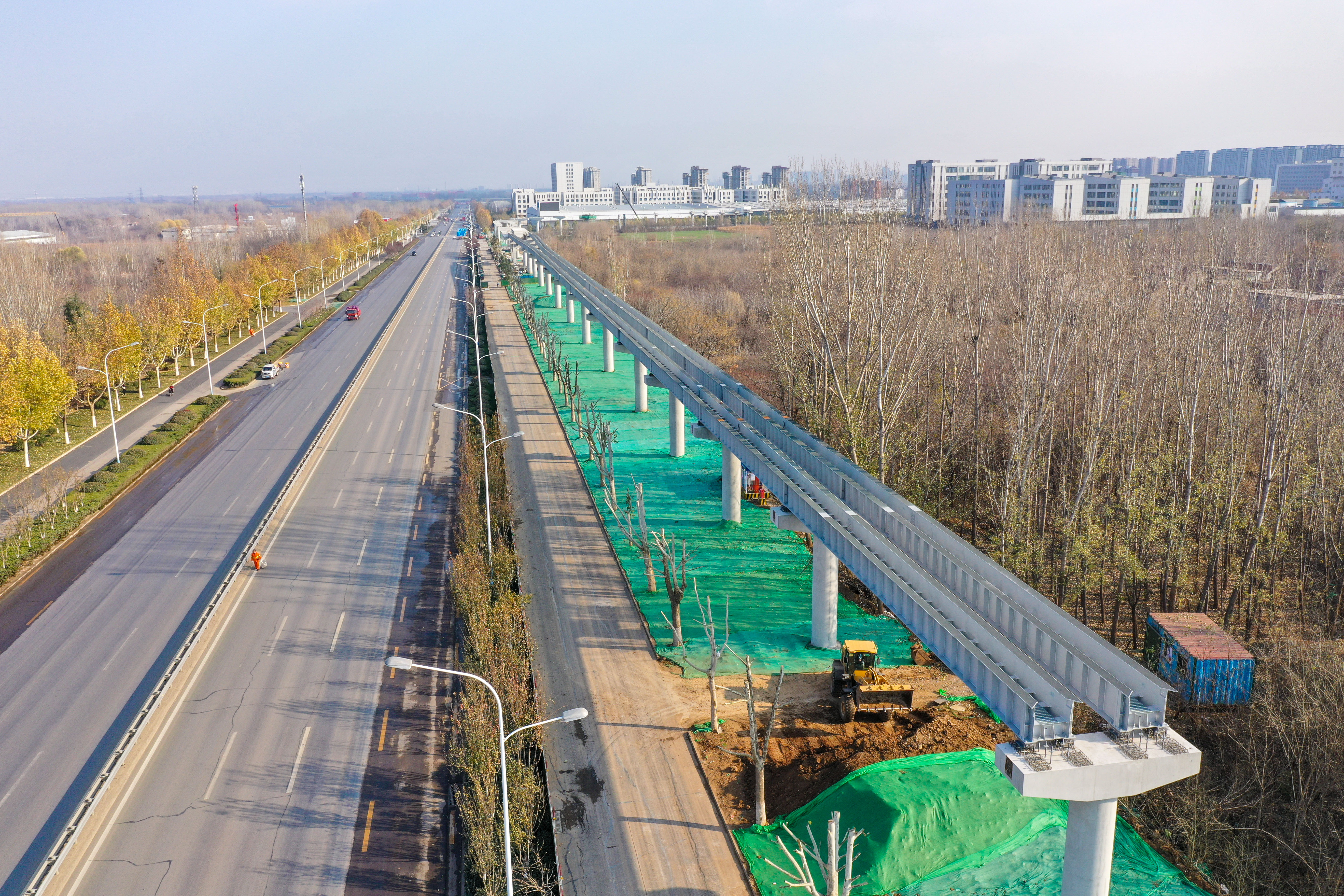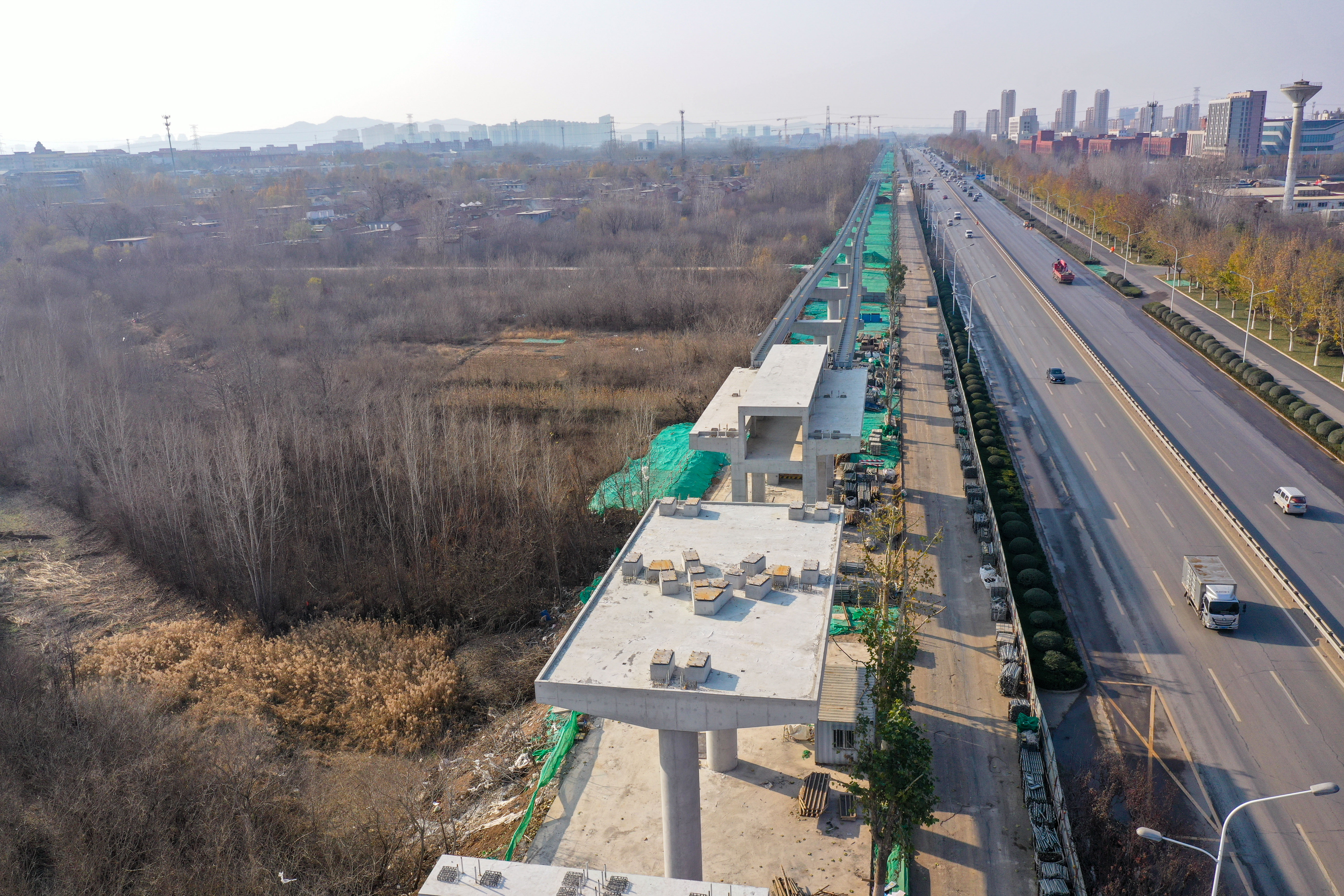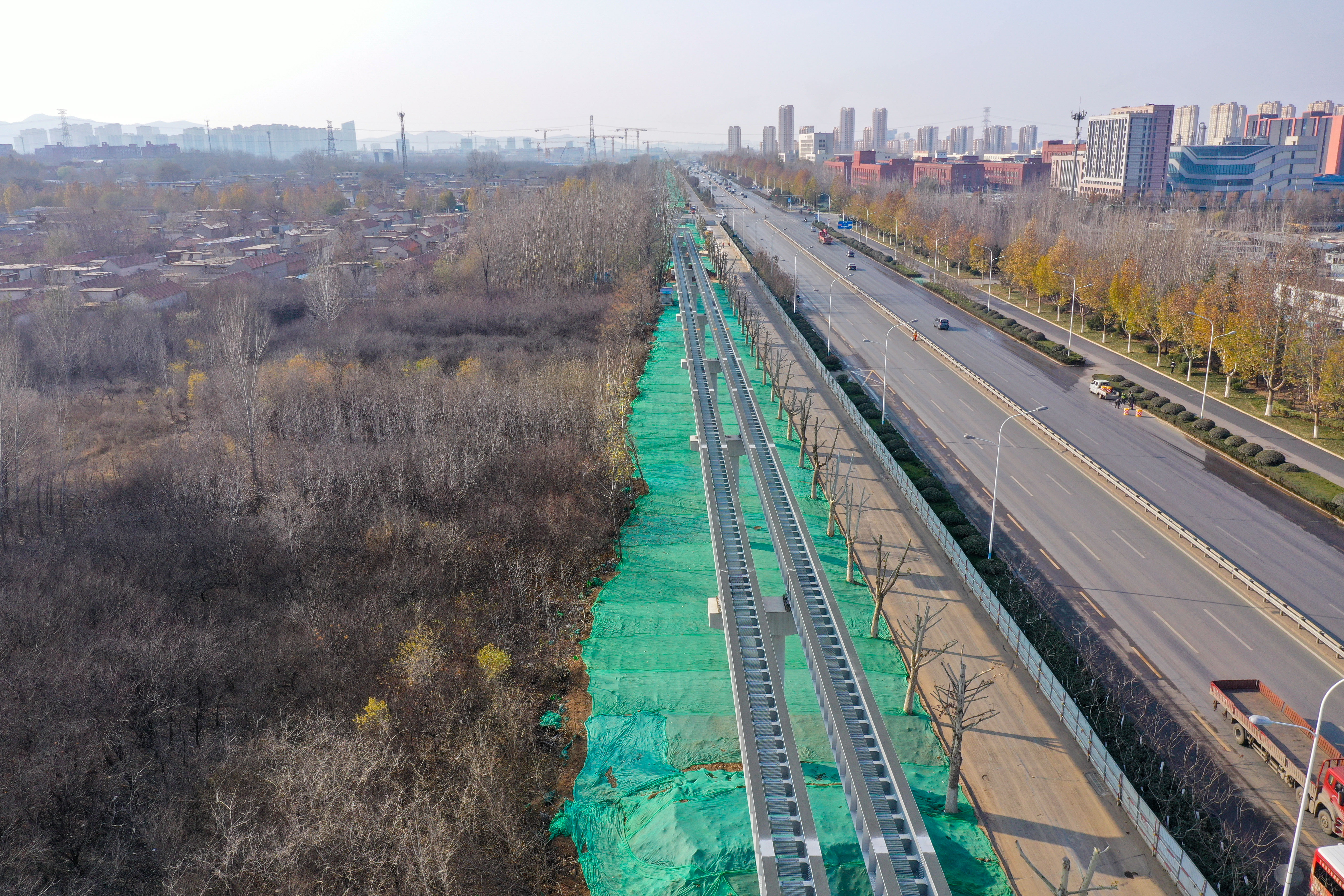 大众新闻·齐鲁壹点记者 周青先 12月中旬,寒冬季节将来。济南世纪大道沿线,新建成的云巴高架路轨和墩柱沿主干道边灵活走线。 目前济南低运量轨道交通高新东区环线工程正加速建设。该项目全长约30.7公里,设车站32座。目前项目正加快推进墩柱、车站和轨道梁架设等工程建设,整个项目计划2025年底前建成通车。