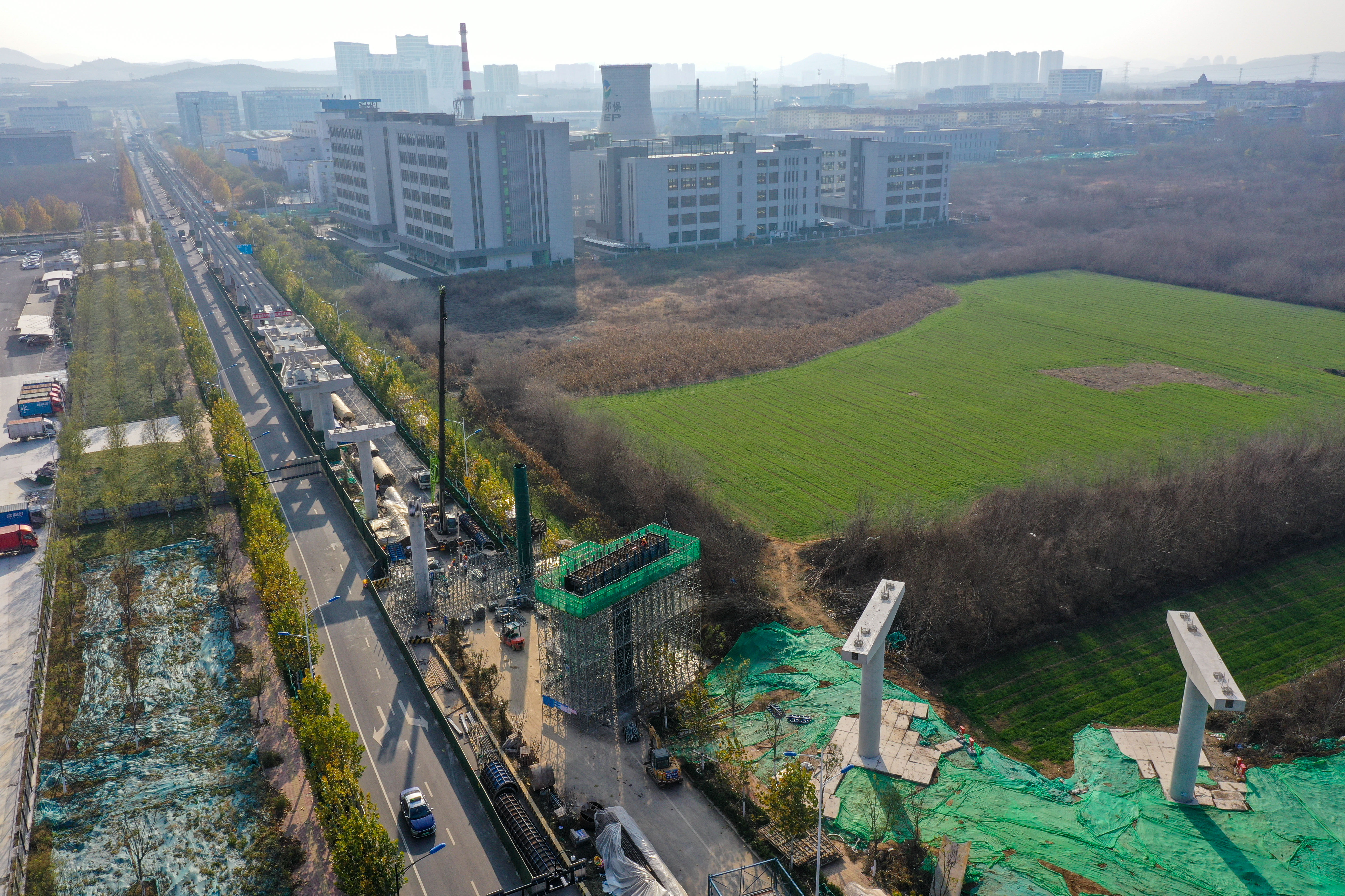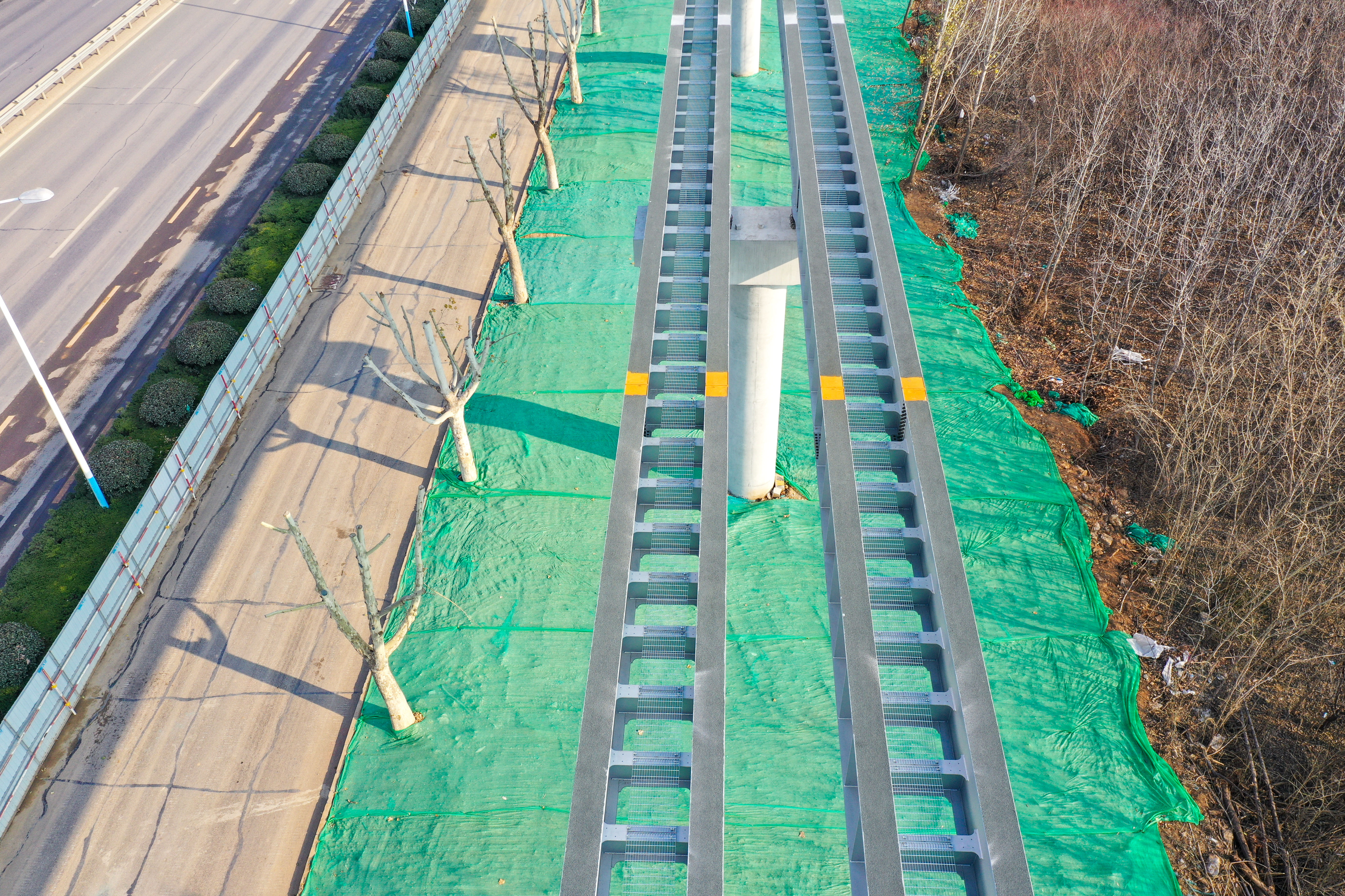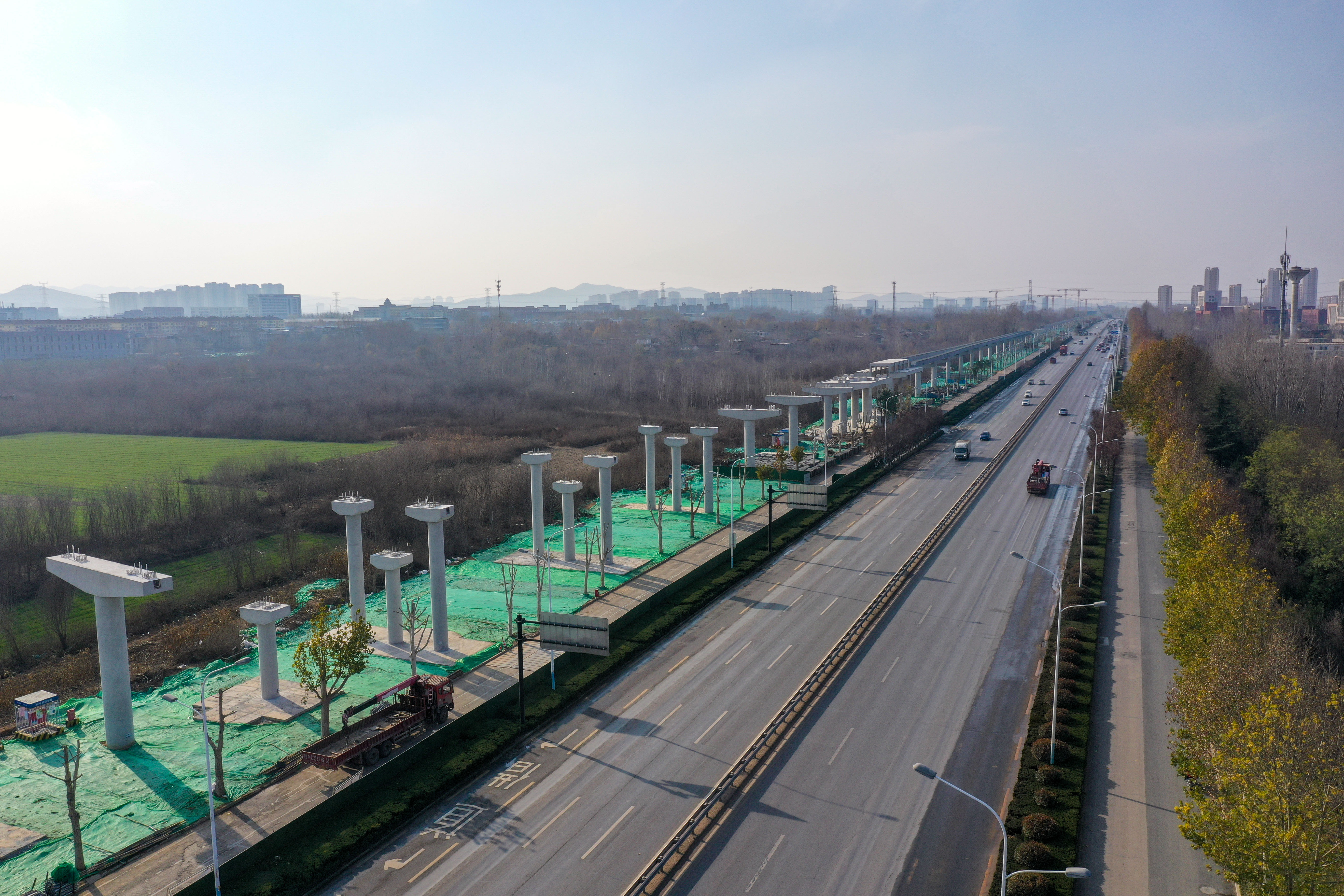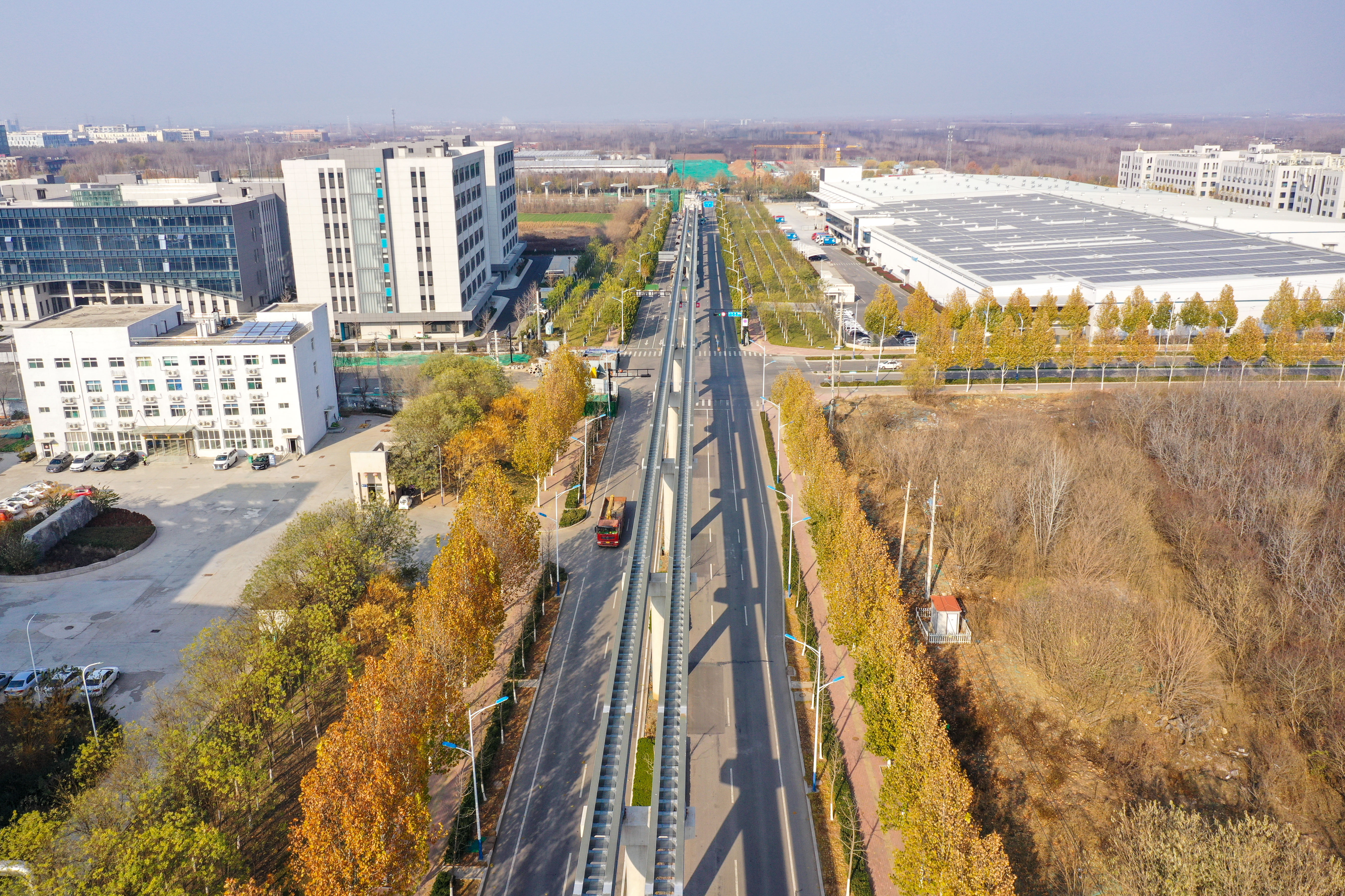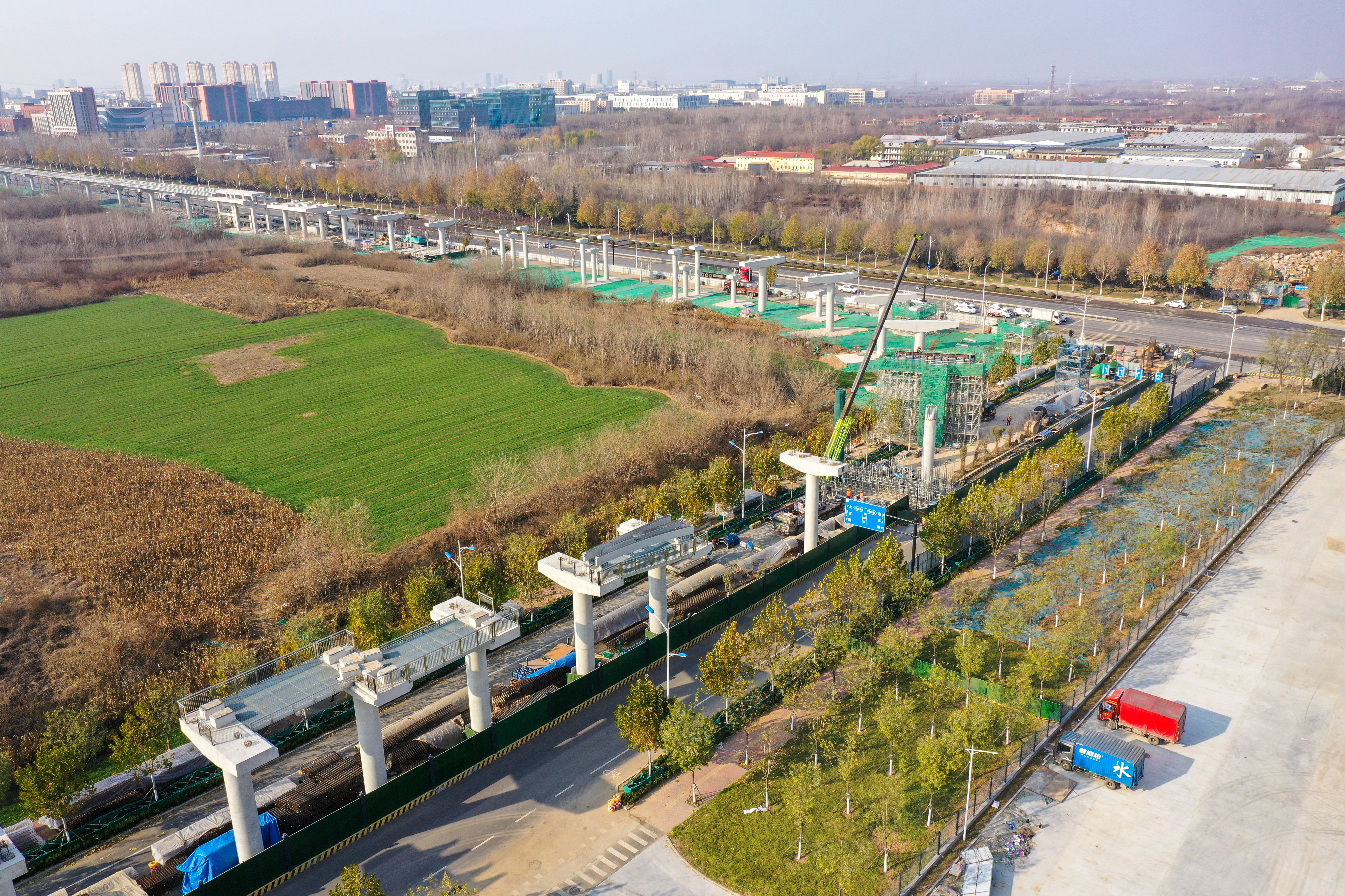 大众新闻·齐鲁壹点记者 周青先 12月中旬,寒冬季节将来。济南世纪大道沿线,新建成的云巴高架路轨和墩柱沿主干道边灵活走线。 目前济南低运量轨道交通高新东区环线工程正加速建设。该项目全长约30.7公里,设车站32座。目前项目正加快推进墩柱、车站和轨道梁架设等工程建设,整个项目计划2025年底前建成通车。