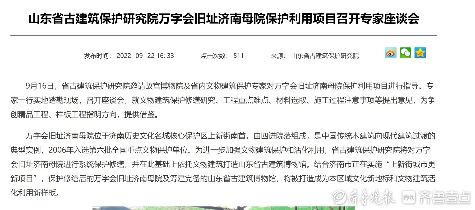 万字会旧址济南母院未来该如何保护利用?记者梳理相关资料发现,早在2022年9月,山东省古建筑保护研究院召开万字会旧址济南母院保护利用项目专家座谈会。其中提到,为进一步加强文物建筑保护和活化利用,省古建筑保护研究院将对万字会旧址济南母院进行系统保护修缮,并在此基础上依托文物建筑打造山东省古建筑博物馆。结合济南市正在实施“上新街城市更新项目”,保护修缮后的万字会旧址济南母院及筹建完备的山东省古建筑博物馆,将被打造成为本区域文化新地标和文物建筑活化利用新样板。